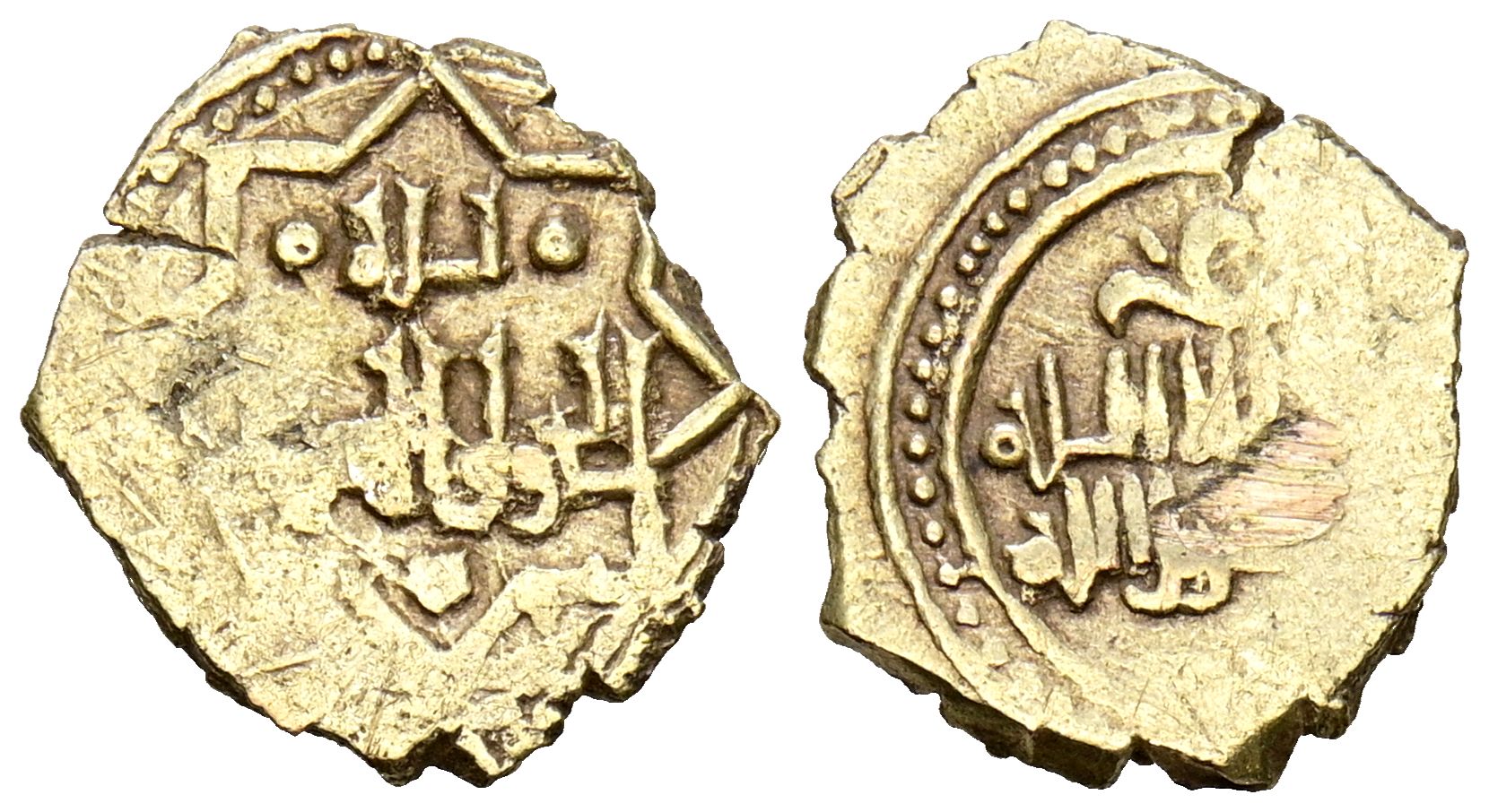 TAIFAS DEL CALIFATO, Anónimo atribuído a Toledo. Fracción de Dinar. (El. 0,79g/13mm). S/D. (Codera y Zaidin (1897) 1047 bis; Ibrahim, Cantó (2003) Suplemento a los Reinos de Taifas, nº 169, Francés nº362). Anv: لااله الاالله / محمدرسول الله. Rev: الح و ل و القوة / الله. (Para Dios / el poder y la fuerza). MBC. Escasa.