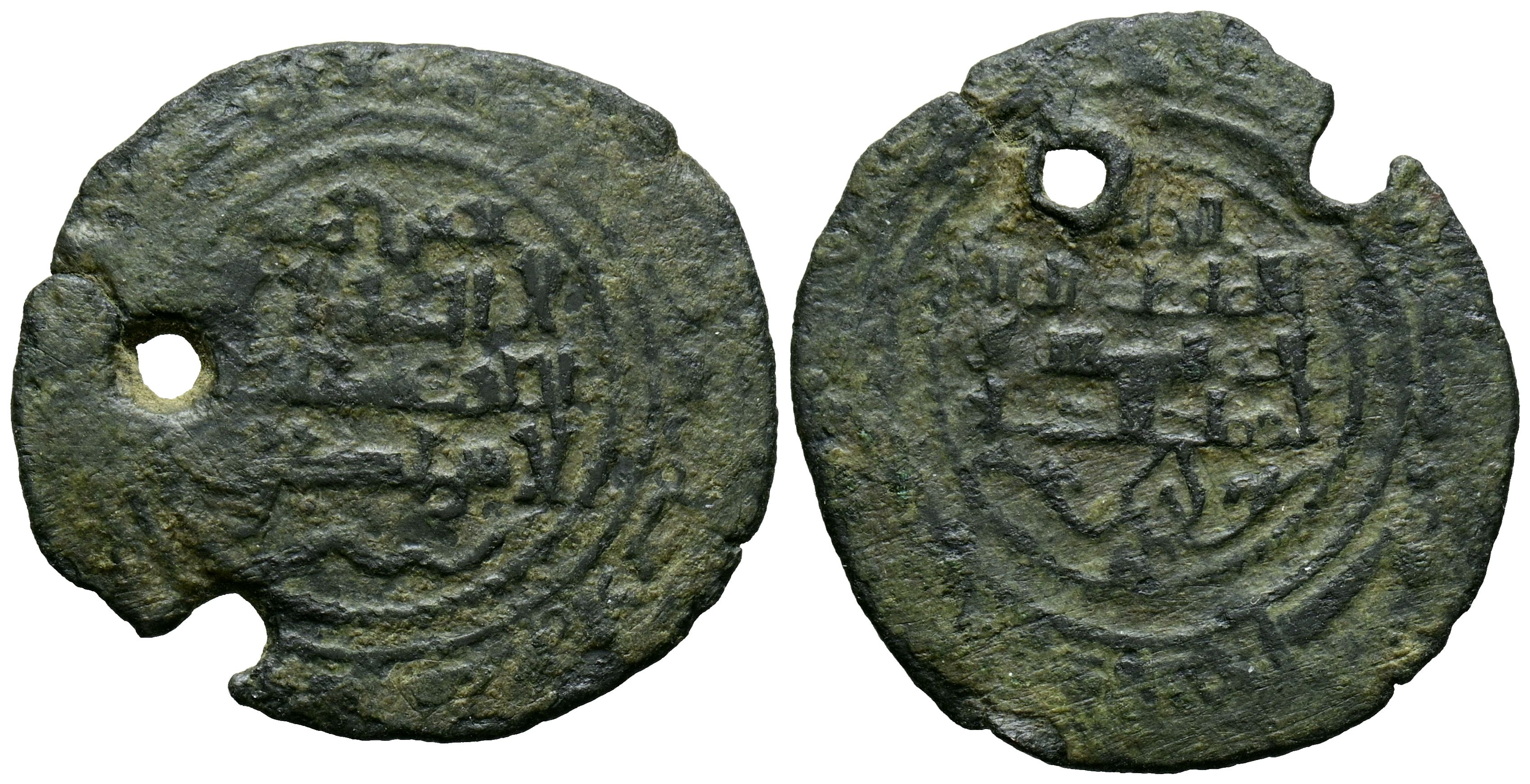 TAIFAS DEL CALIFATO, MORÓN (Banu Dimmar). Anónima a nombre de Imad al-Dawla. Dirham. (Ae. 2,66g/28mm). ¿458H? al-Andalus / الاندلس. (Francés 272; Francés y Gaspariño, Omni nº6 (2013) p. 118-126). Anv: Arriba jaculatoria: العزة لله (La gloria es ''toda ella'' para Dios). Rev: Invocación al Iman Abd Allah y cita a: عماد الدوله / الحاجب (el hayib / ‘Imad al Dawla). MBC+. Perforaciones. Rarísimo ejemplar.