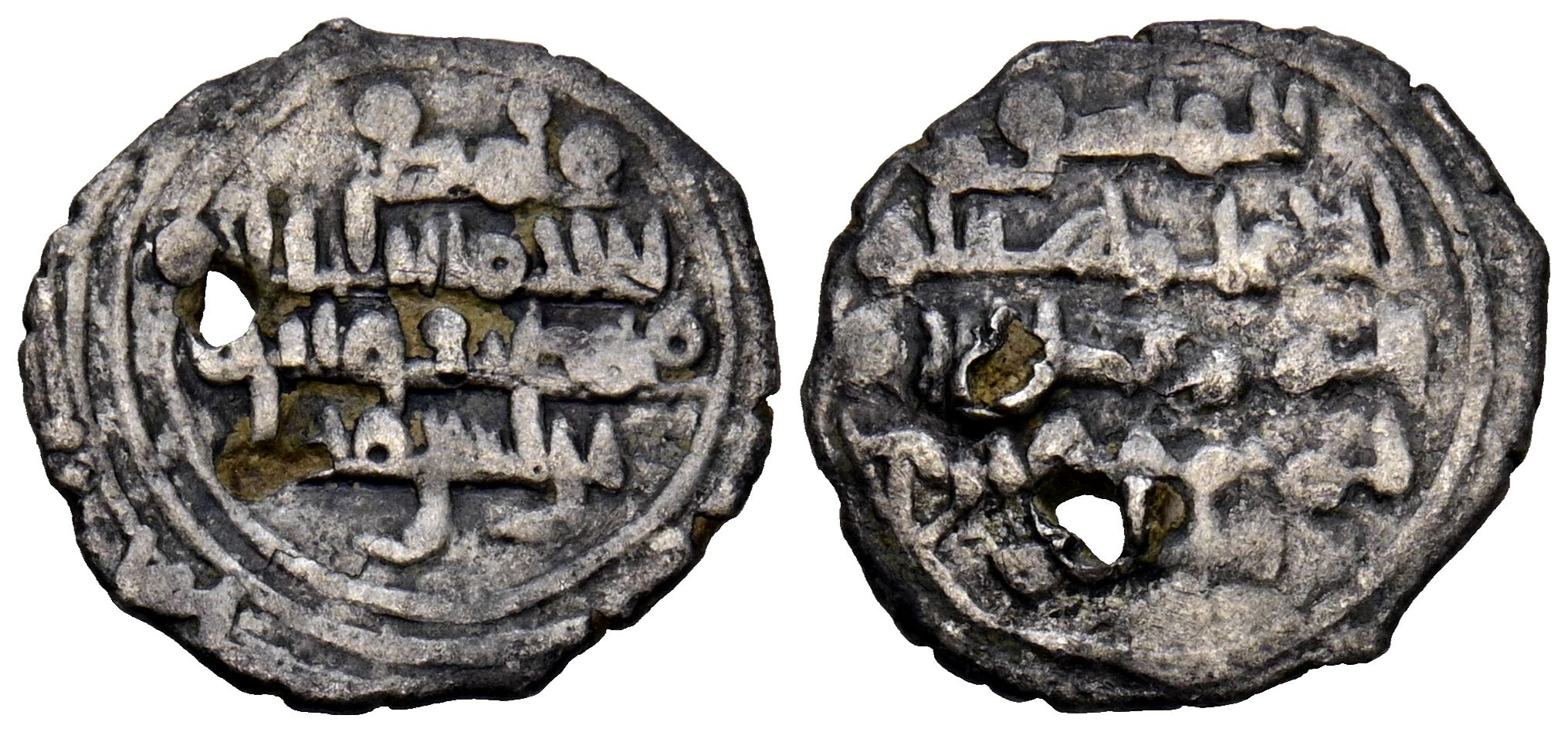 TAIFAS DEL CALIFATO, ALMERIA (Amíries de Valencia). Abd al-Aziz, al-Mansur. Fracción de Dirham. (Ar. 0,82g/14mm). 435-439H. al-Mariya (Almería) / المـرية. (Vives tipo1035; Prieto 174c). Orla del anverso parcialmente visible. Citando a محمد (Muhammad) / ¿ابن اسود? en IA. y المنصور (al-Mansur/ الناصر (al-Nasir) en IIA. MBC. Dos perforaciones. Escaso e interesante ejemplar.