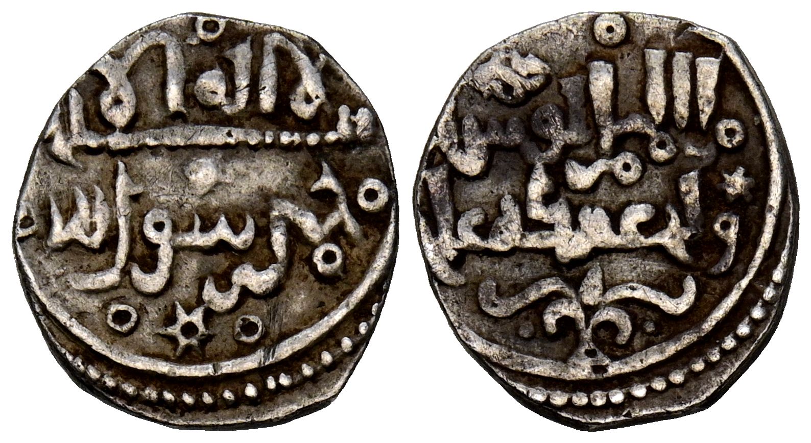 ALMORAVIDES, Yusuf ben Tashfin y Emir Ali (497-500H). Quirate. (Ar. 0,86g/12mm). S/D. (Vives no cita; Benito Bb15). Anv: 'Shahada' en tres líneas. Rev: امير المسلين توسف (Amir al-Muslimin Yusuf) / ولي عهده علي (su heredero 'Alí). MBC+/EBC-. Muy rara, solo tenemos constancia de otro ejemplar similar, origen de su catalogación y vendido por Martí Hervera & Soler y LLach, Subasta 1108 (09/05/2019), Nºlote 1026.