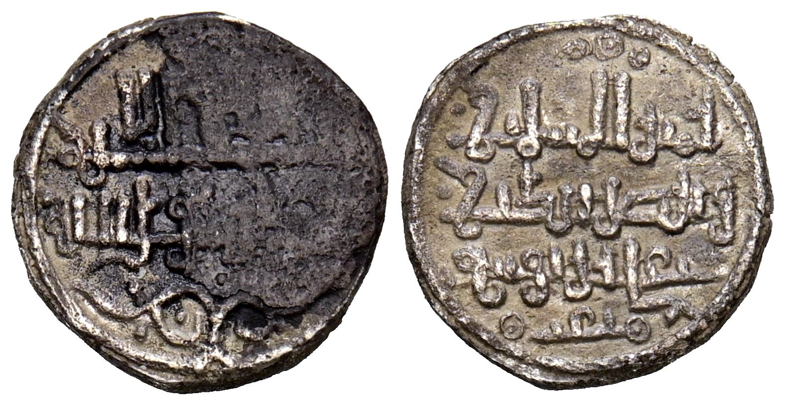 ALMORAVIDES, 'Ali ben Yusuf (500-537H). Quirate. (Ar. 0,91g/13mm). (Vives no cita; Frochoso 9; Benito Cc12). Anv: 'Shahada' en tres líneas. Rev: Presenta a Ali con títulos de Amir al-Muslimin y Nasir al-Din. MBC+. Oxidaciones en anverso. Rara.