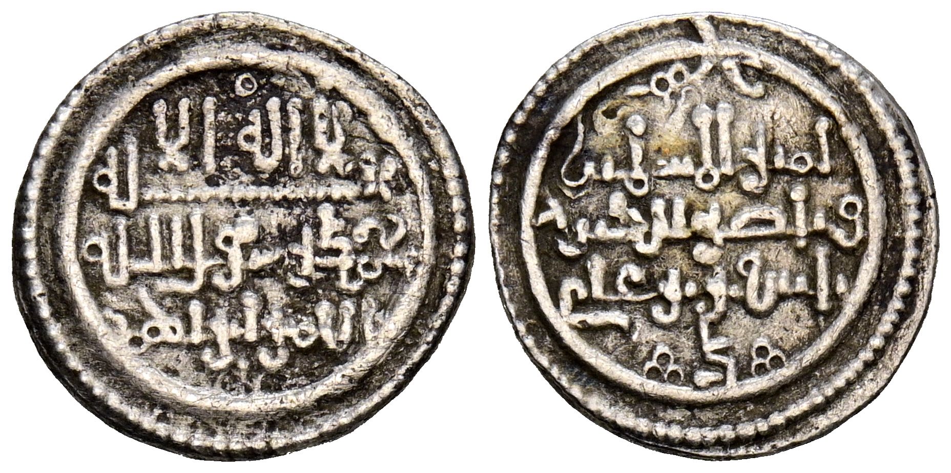 ALMORÁVIDES, Tashfin ben Ali con Ibrahim como heredero (539-540H). Quirate. (Ar. 0,86g/13mm). S/D. (Vives 1885; Hazard 1035; Benito Db2). Anv: 'Shahada' en tres líneas, debajo mención al heredero: الامير ابرهيم. Rev: Presenta a Tashfin con títulos de Amir al-Muslimin y Nasir al-Din. MBC.