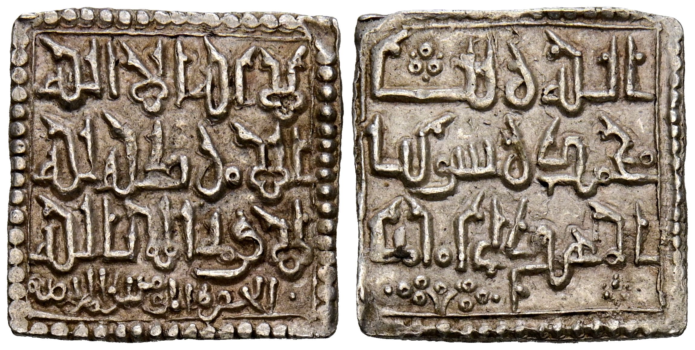 ALMOHADES, Abu Hafs Umar al-Murtada (646-665H). Dirham. (Ar. 1,56g/16mm). الحضرة المو منية المر تضية / Al-Hadrat al-Muminiyya al-Murtadiyya (Sejilmesa). (Gaspariño, Jarique IV pp. 213-226; Hohertz 563; Album 493A). SC-. Precioso y raro ejemplar con epigrafía cúfica ornamentada y un centraje excelente.