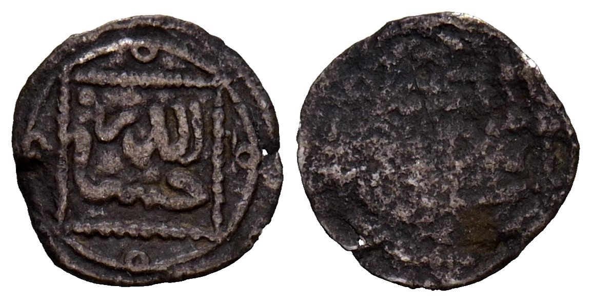 ALMOHADES, Anónimo. 1/16 Dirham de tipo almorávide. (Ar. 0,09g/8mm). S/D. Anv: الله / حسبنا (Dios me basta). Rev: Anepígrafo. MBC+. Este raro divisor a medio camino entre la tradicional forma redonda del Quirate y la leyenda del 1/8 de Dirham almohade cuadrado (Hohertz 645), contiene en su diseño algunas características similares a los 1/2 Dirhams redondos atribuídos por Peña Martín a Idris I (Hohertz 633 y notas).