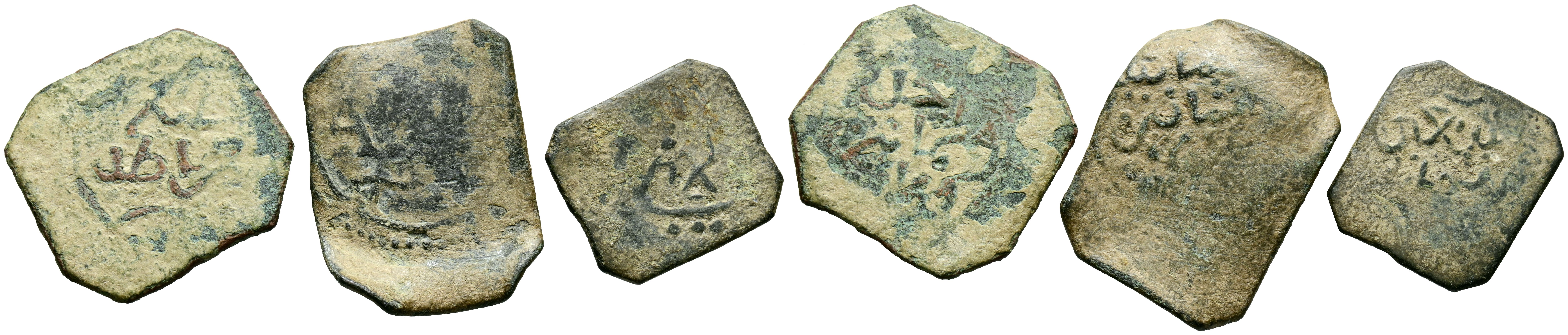 NAZARÍES DE GRANADA. Interesante cojunto formado por tres escasos féluses con ceca Bi-Gharnata / بــغرناطة y correspondientes a los años 881, 888 y 892H?. Diferentes medidas y estados de conservación. A EXAMINAR.