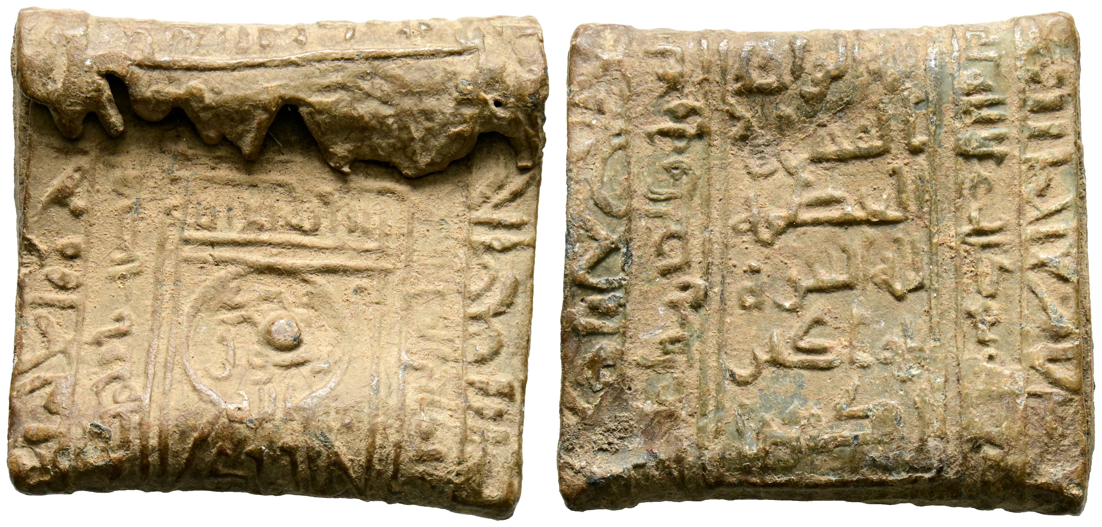 PERIODO DE TAIFAS O ALMORÁVIDE. Amuleto de Mihrab". (Pb. 13,33g/26x25mm). Posiblemente Siglo X-XII. Placa rectangular de plomo plegada en forma de tríptico cerradoy rematado con almenas triangulares en el bode superior. . Amuleto de los denominados "de mihrab", presenta en su parte visible escritura cúfica elegante. Las leyendas se distribuyen en una doble banda epigrafica de enmarque, y un campo central en forma de arco de herradura que contiene en su interior 10 líneas de escritura visibles. (Amuletos Tipo A-VI). EBC-. Inédito.