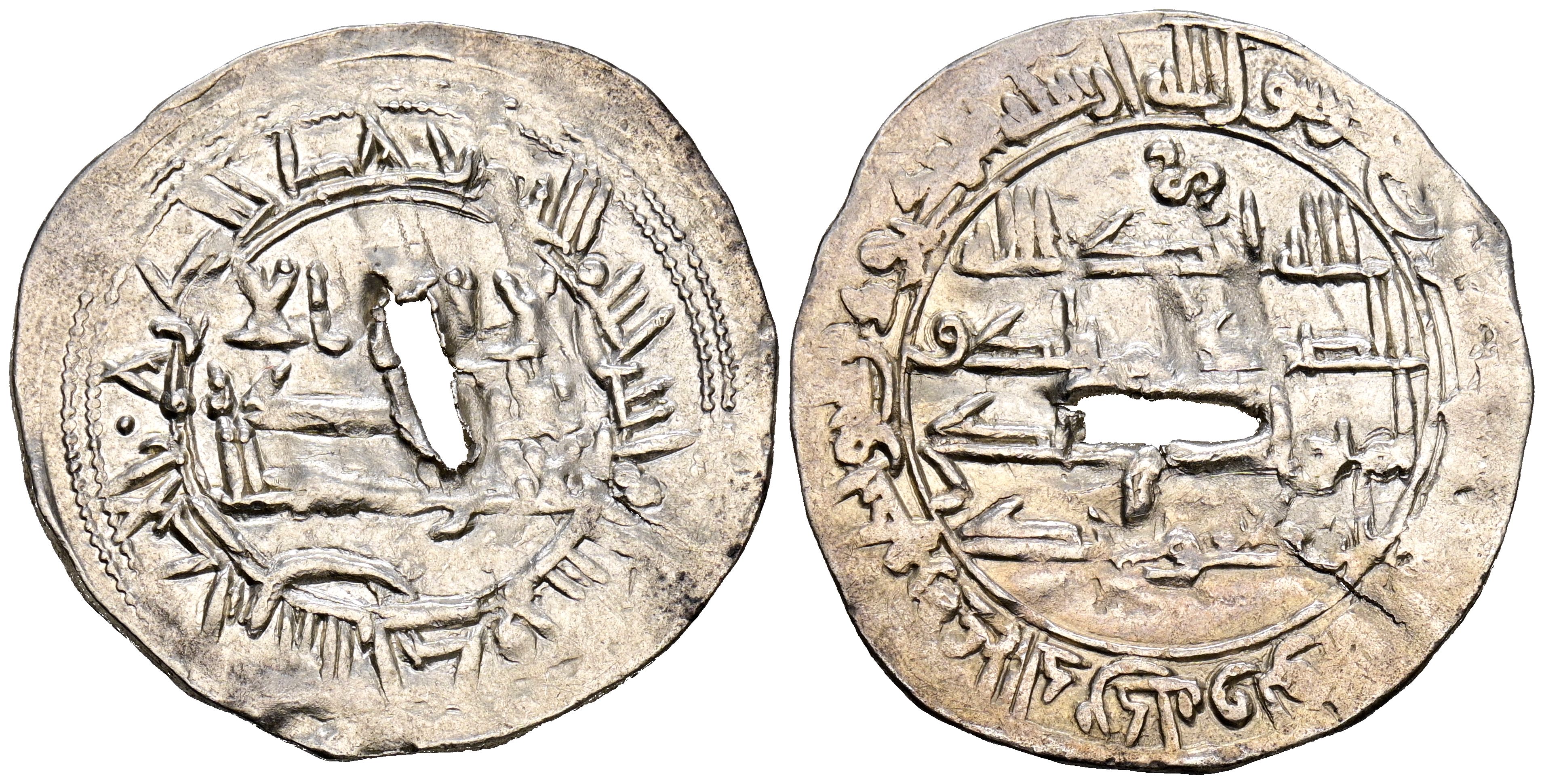 EMIRATO INDEPENDIENTE DE CÓRDOBA. Muhammad I. Dirham. (Ar. 2,65g/27mm). 251H. al-Ándalus / الاندلس. (Vives 262; Frochoso 251.3). MBC-. Perforación central. Restos de brillo original.