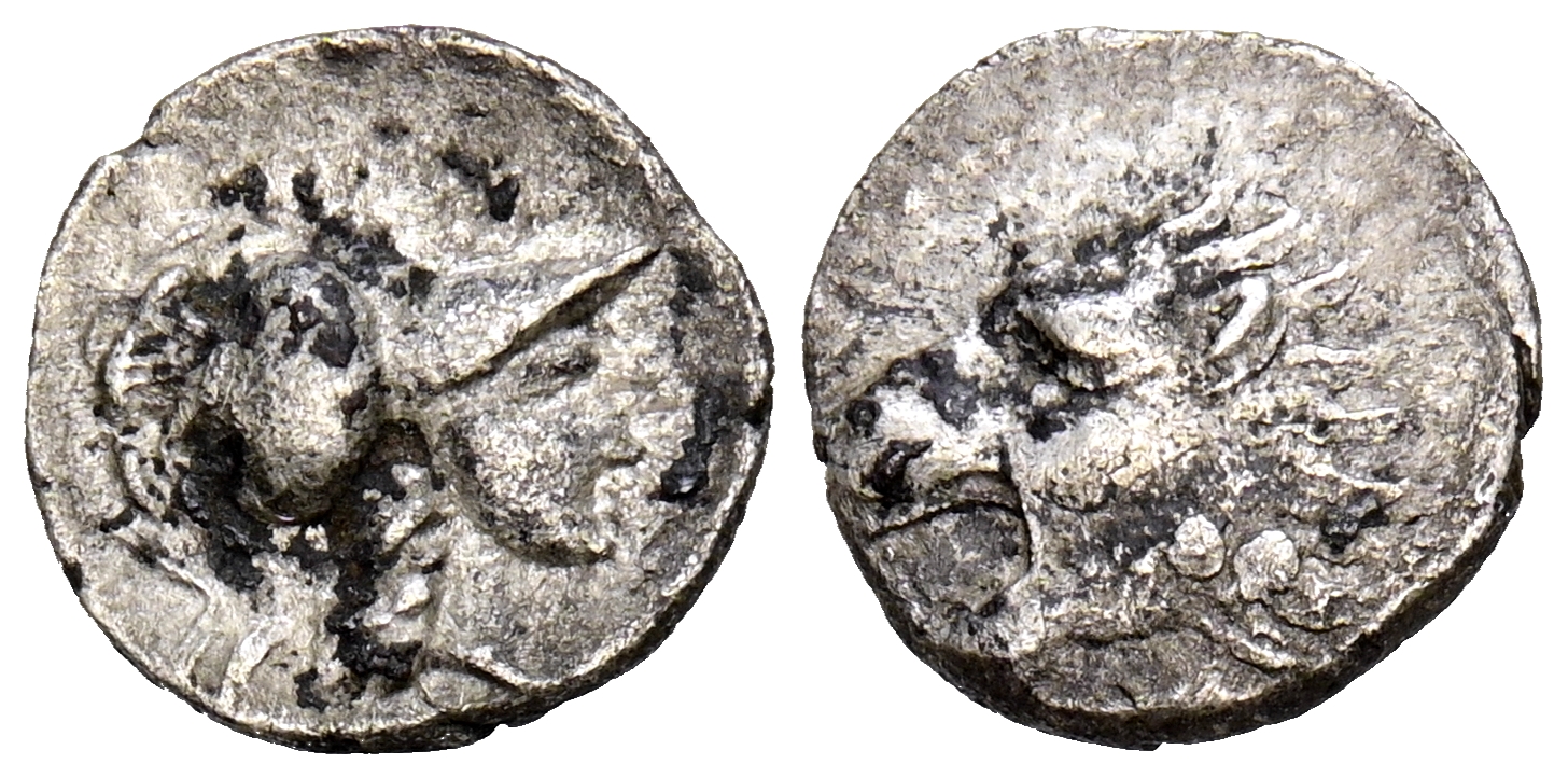 PAMPHYLIA, Side. Óbolo. (Ar. 0,43g/10mm). Siglo III-Siglo II a.C. (SNG BN 739). Anv: Cabeza de Atenas a derecha. Rev: Cabeza de león a izquierda. MBC.