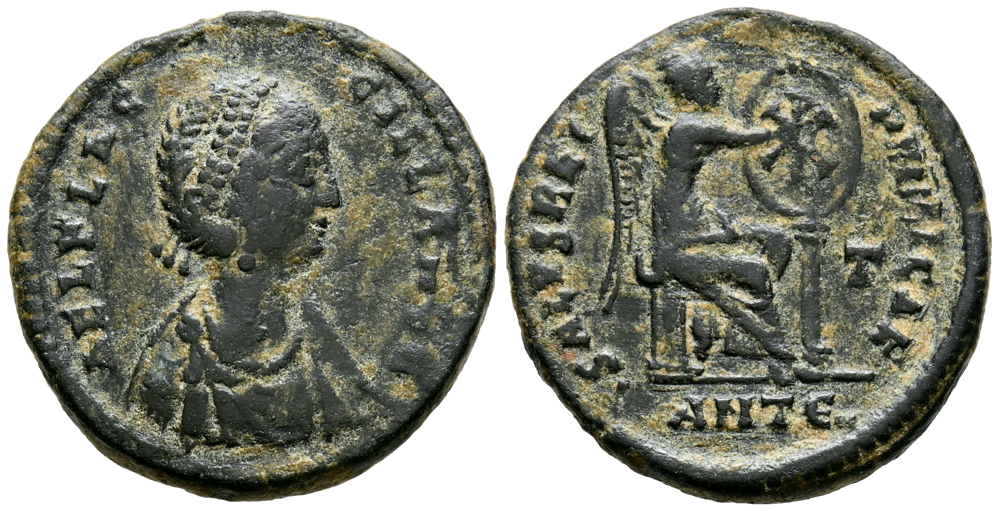 AELIA FLACILLA. Maiorina. (Ae. 5,60g/23mm). 379-383 d.C. Antioquía. (RIC 43). Anv: Busto diademado, drapeado y con coraza de Aelia Flacilla a derecha, alrededor leyenda: AEL FLACCILLA AVG. Rev: Salus sentada sobre columna a derecha portando escudo con monograma sobre columan, delante T, en exergo: ANTE, alrededor leyenda: SALVS REI PVBLICAE. MBC-.
