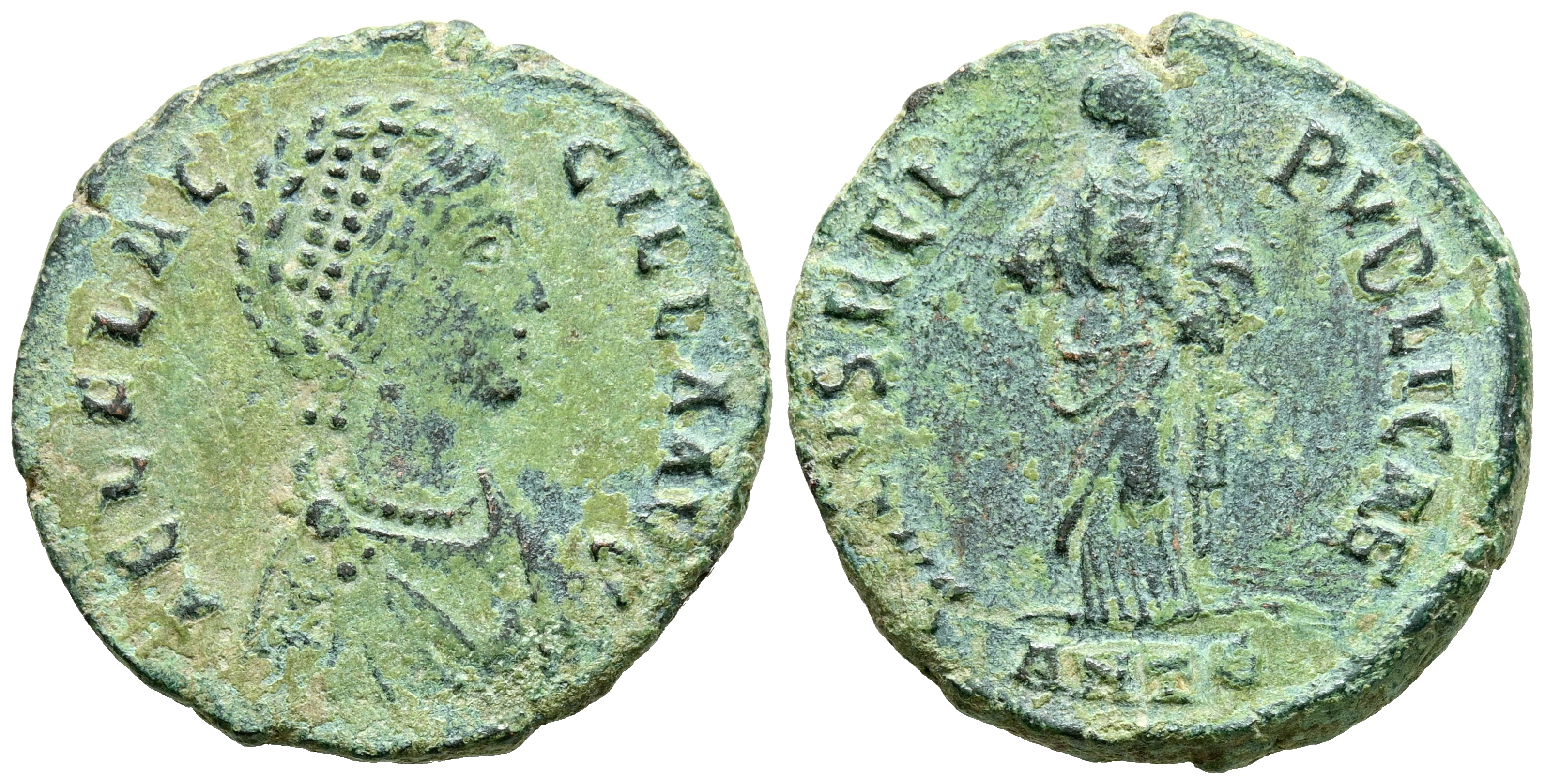 AELIA FLACILLA. Maiorina. (Ae. 5,05/22mm). 383-386 d.C. Antioquía. (RIC 62). Anv: Busto diademado y drapeado de Aelia Flacilla a derecha, alrededor leyenda: AEL FLACILLA AVG. Rev: Salus estante de frente mirando a derecha y cruzando los brazos, en exergo: ANTE, alrededor leyenda: SALVS REI PVBLICAE. MBC.