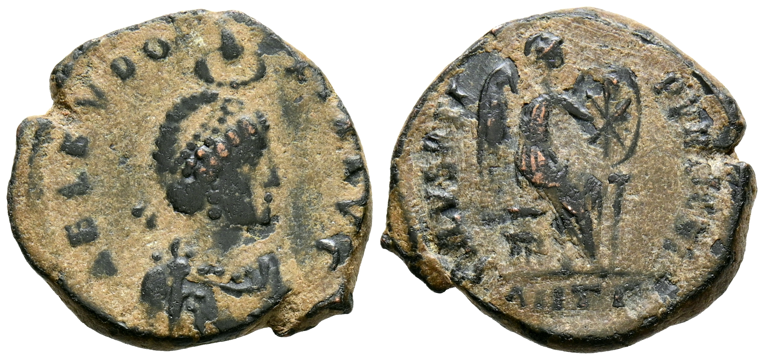 AELIA EUDOXIA. Follis. (Ae. 3,33g/18mm). 401-403 d.C. Antioquía. (RIC 104). Anv: Busto diademado y drapeado de Aelia Eudoxia a derecha, alrededor leyenda: AEL EVDOXIA AVG. Rev: Victoria sentada sobre escudo a derecha inscribiendo en cristograma, alrededor leyenda, en exergo: ANTr, alrededor leyenda: SALVS REI PVBLICAE. MBC.