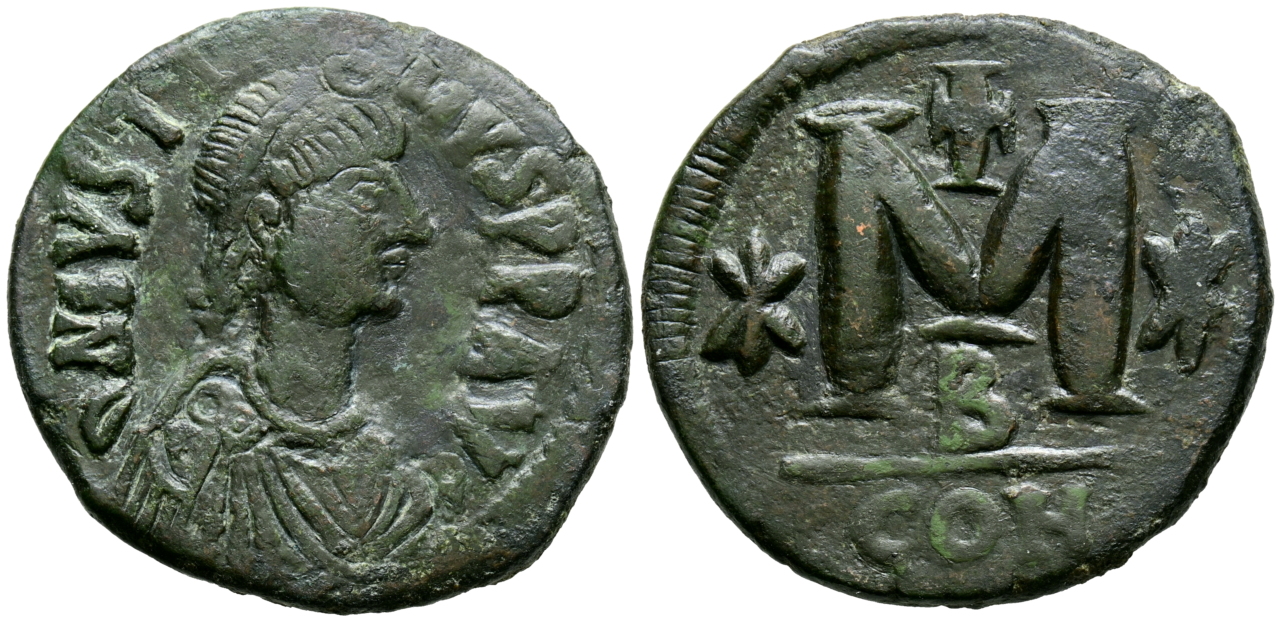 JUSTINIANO I. Follis. (Ae. 13,53g/31mm). 518-527 d.C. Constantinopla. (Seaby 62). Anv: Busto laureado y drapeado de Justiniano I a derecha, alrededor leyenda: D N IVSTINIANVS P AVG. Rev: M grande, Cruz encima y B debajo, a los lados estrellas, en exergo: CON. MBC.