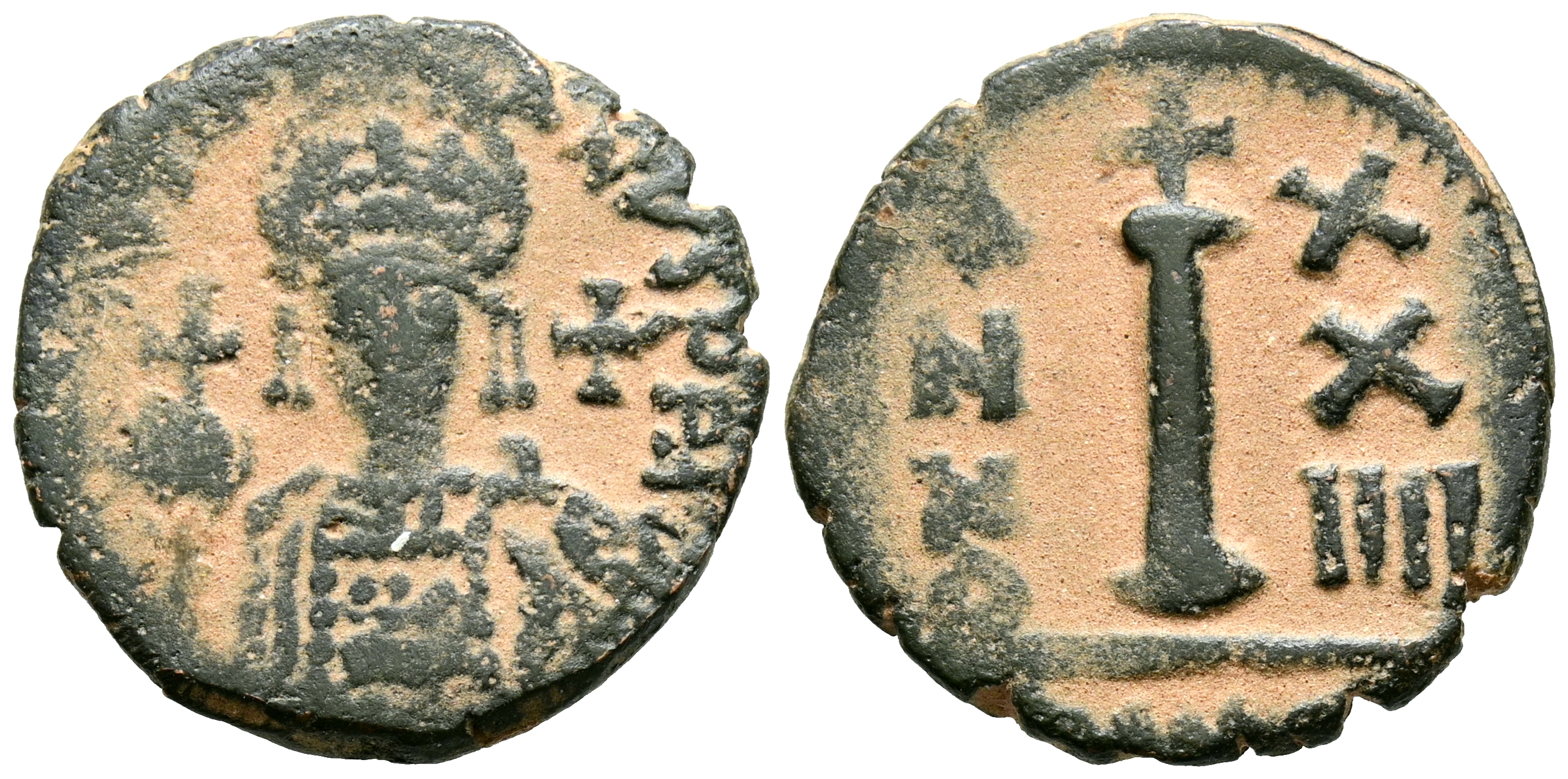 JUSTINIANO I. Decanumium (Ae. 3,93g/19mm). 550-1 d.C. Theoupolis (Antioquía). (Sellar 236). Anv: Busto coronado y con coraza de Justino I de frente, sosteniendo globo cruciforme a izquierda y escudo a derecha; cruz a la derecha, alrededor leyenda: D N IVSTINIANVS PP AVG. Rev: Gran I; encima cruz, a los lados: ANNO-XXIIII, en exergo: tHEUP. MBC-.