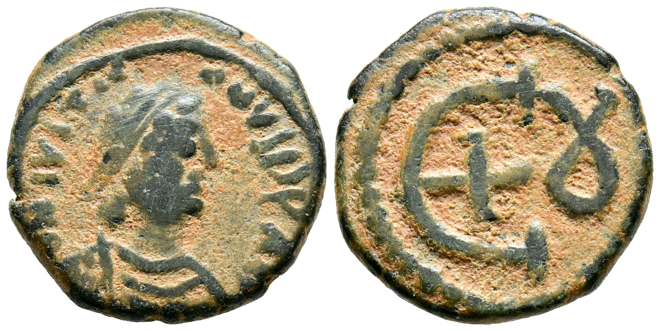JUSTINIANO I. Pentanummio. (Ae. 2,50g/16mm). 551-561 d.C. Teúpolis (Antioquía). (Seaby 243). Anv: Busto laureado y drapeado de Justiniano I a derecha, alrededor leyenda. Rev: E grande con cruz en el centro, delante monograma OY. MBC.