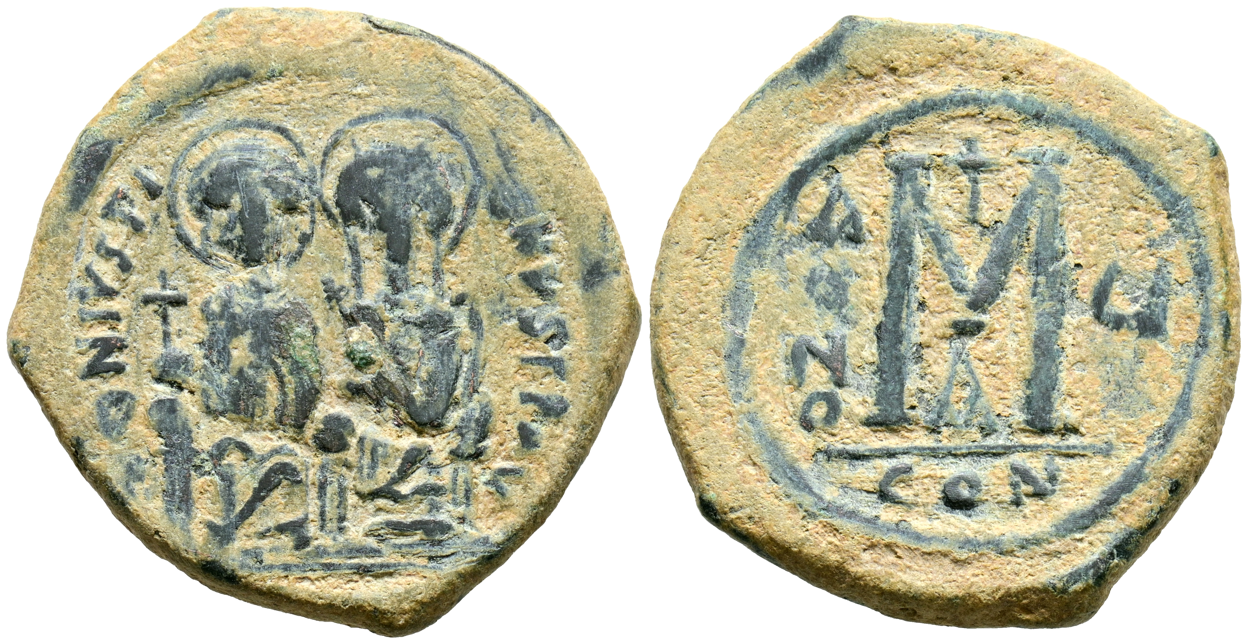 JUSTINO II Y SOFÍA. Follis. (Ae. 13,68g/32mm). 571-572 d.C. Constantinopla. (Seaby 360). Anv: Justino II y Sofía estantes de frente, alrededor de la leyenda: DN IVSTINVS PP AVG. Rev: M, encima cruz latina, debajo: A, a los lados: ANNO-Ç1, en exergo: CON. MBC.