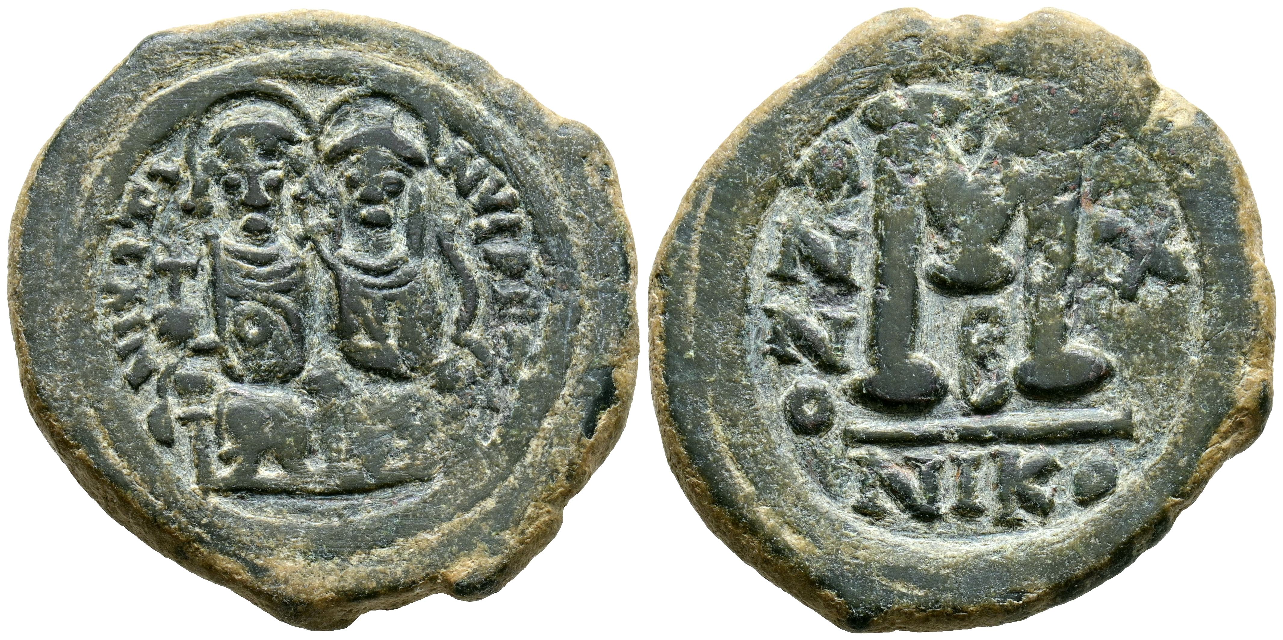 JUSTINO II y SOFIA. Follis. (Ae. 13,62g/31mm). 565-578 d.C. Nicomedia. (Seaby 369). Anv: Justino II y Sofia sentados de frente, alrededor leyenda: DN IVSTINVS PF AVG. Rev: M grande, encima cruz y debajo B, entre: ANNO-X, en exergo: NIKO. MBC.