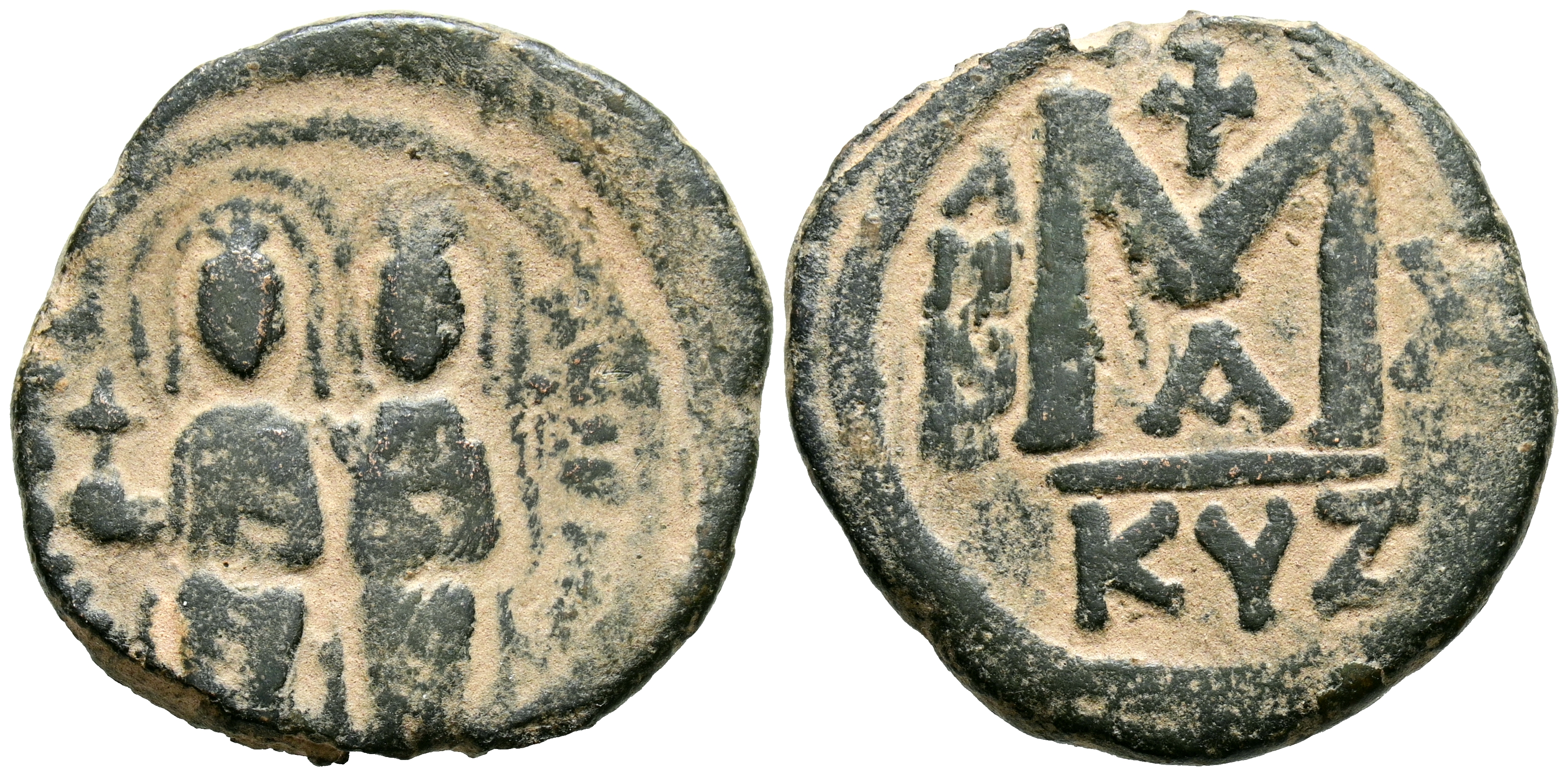 JUSTINO II y SOFÍA. Follis. (Ae. 9,65g/26mm). 574-5 d.C. Cícico. (Seaby 373). Anv: Justino y Sofía sentados y nimbados, alrededor leyenda. Rev: M grande, Cruz arriba y A debajo, a los dálos: ANNO X, en exergo: KYZ. MBC-.