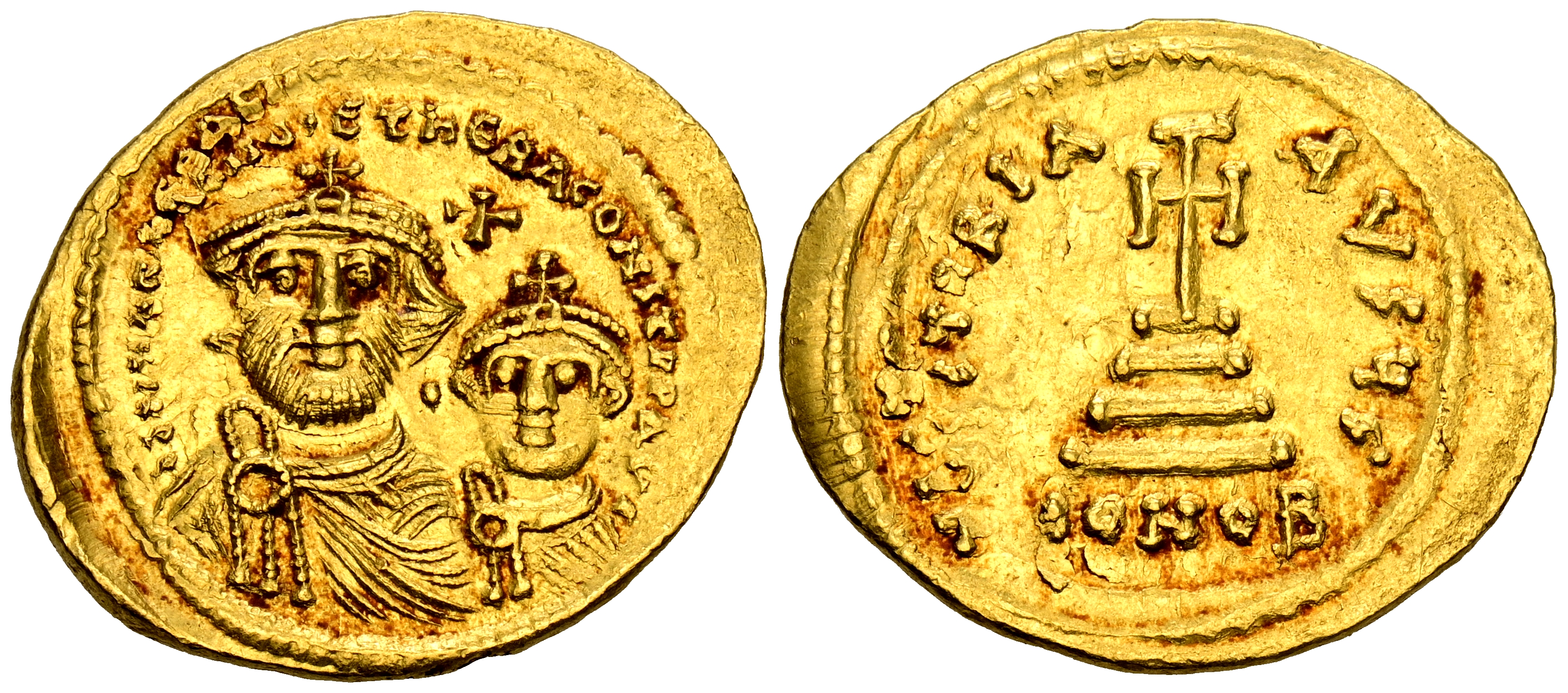 HERACLIO y HERACLIO CONSTANTINO. Sólido. (Au. 4,50g/23mm). 626-629 d.C. Constantinopla. (Seaby 743). Anv: Bustos coronados y drapeados de frente de Heraclio y Heraclio Constantino, sobre ellos cruz, alrededor leyenda: dd NN hЄRACLIЧS Єt hЄRA CONSt P P AV. Rev: Cruz potenzada sobre tres escalones, debajo: CONOB, alrededor leyenda: VICTORIA-AVϚЧ H. EBC-. Precioso ejemplar.