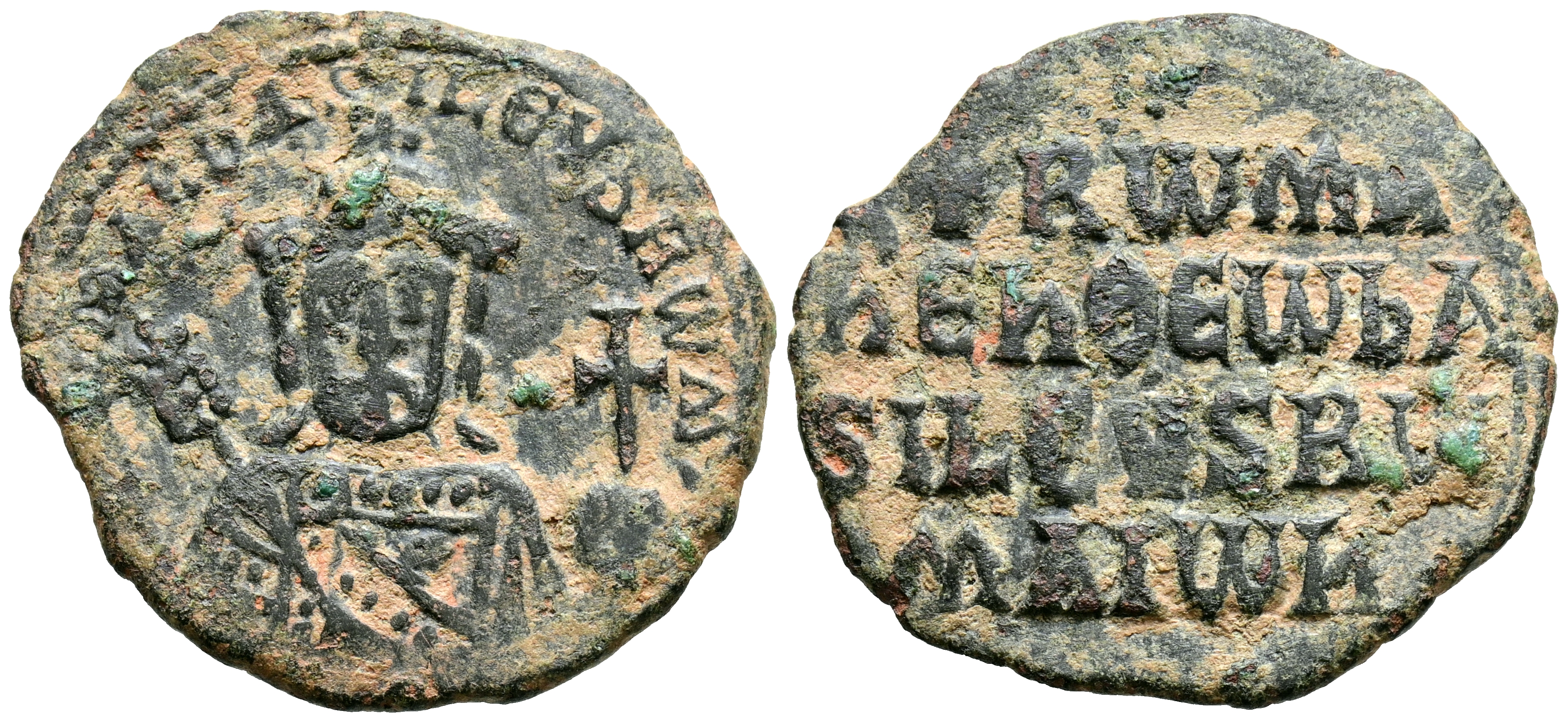 CONSTANTINO VII Porphyrogenitus y ROMANO I. Follis. (Ae. 4,74g/25mm). 913-959 d.C. Constantinopla. (Seaby 1760). Anv: Busto coronado de Constantino VII de frente, portando globo crucífero y labarum, alrededor leyenda: RωMAҺ ЬASILЄVS RωM. Rev: RωmA/Һ' ЄҺ ӨЄω ЬA/SILЄVS Rω/mAIωҺ. MBC.