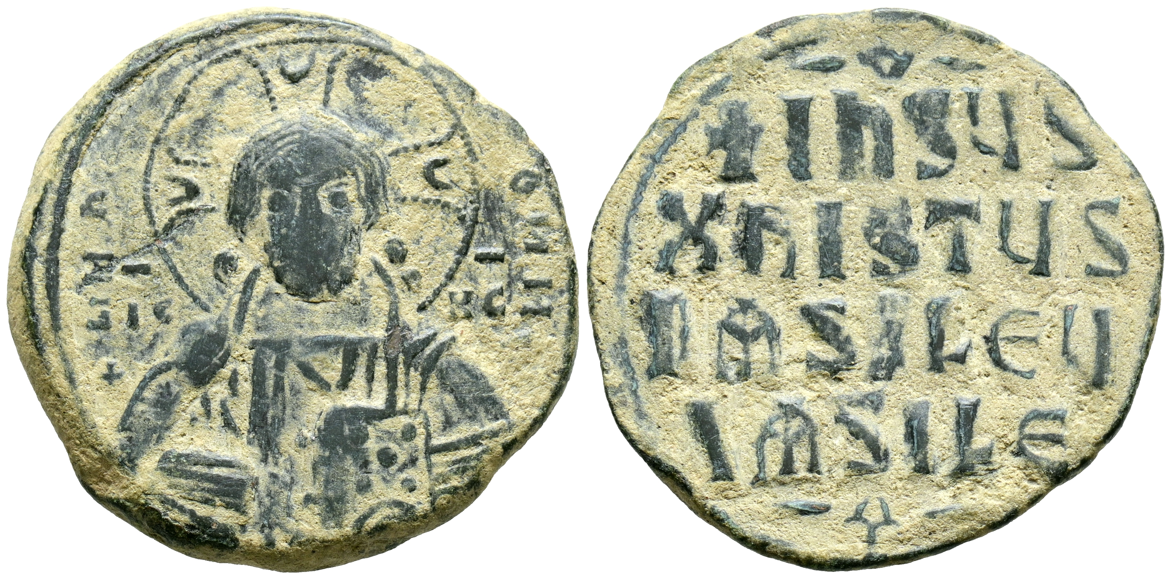 ANONIMO, tiempos de Basilio II y Constantino VIII. Follis. (Ae. 8,17g/28mm). 976-1025 d.C. Constantinopla. (Seaby 1813). Anv: Busto de Cristo de frente sosteniendo Evangelio, en campo: IC - XC, alrededor: EMMA-NOVHΛ. Rev: IhSϤS / XRISTϤS / bASILЄϤ / bASILЄ. MBC.