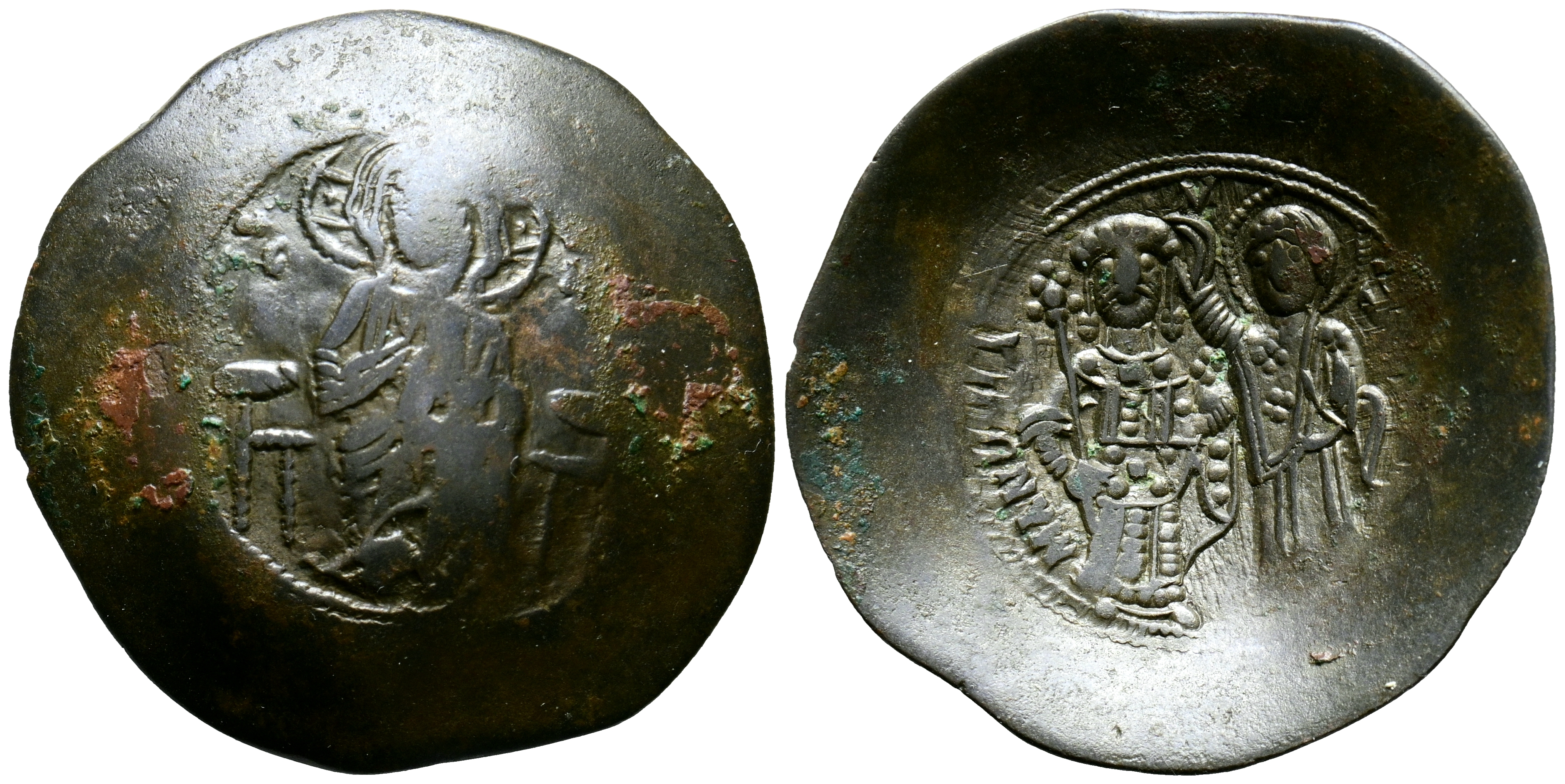 MANUEL I Comneno. Trachy de vellón. (Ae. 3,16g/28mm). 1143-1180 d.C. Constantinopla. (Seaby 1966). Anv: Cristo entronizado de frente, entre IC-XC. Rev: Manuel I estante de frente portando labarum y globo, detrás Virgen con corona. MBC-.