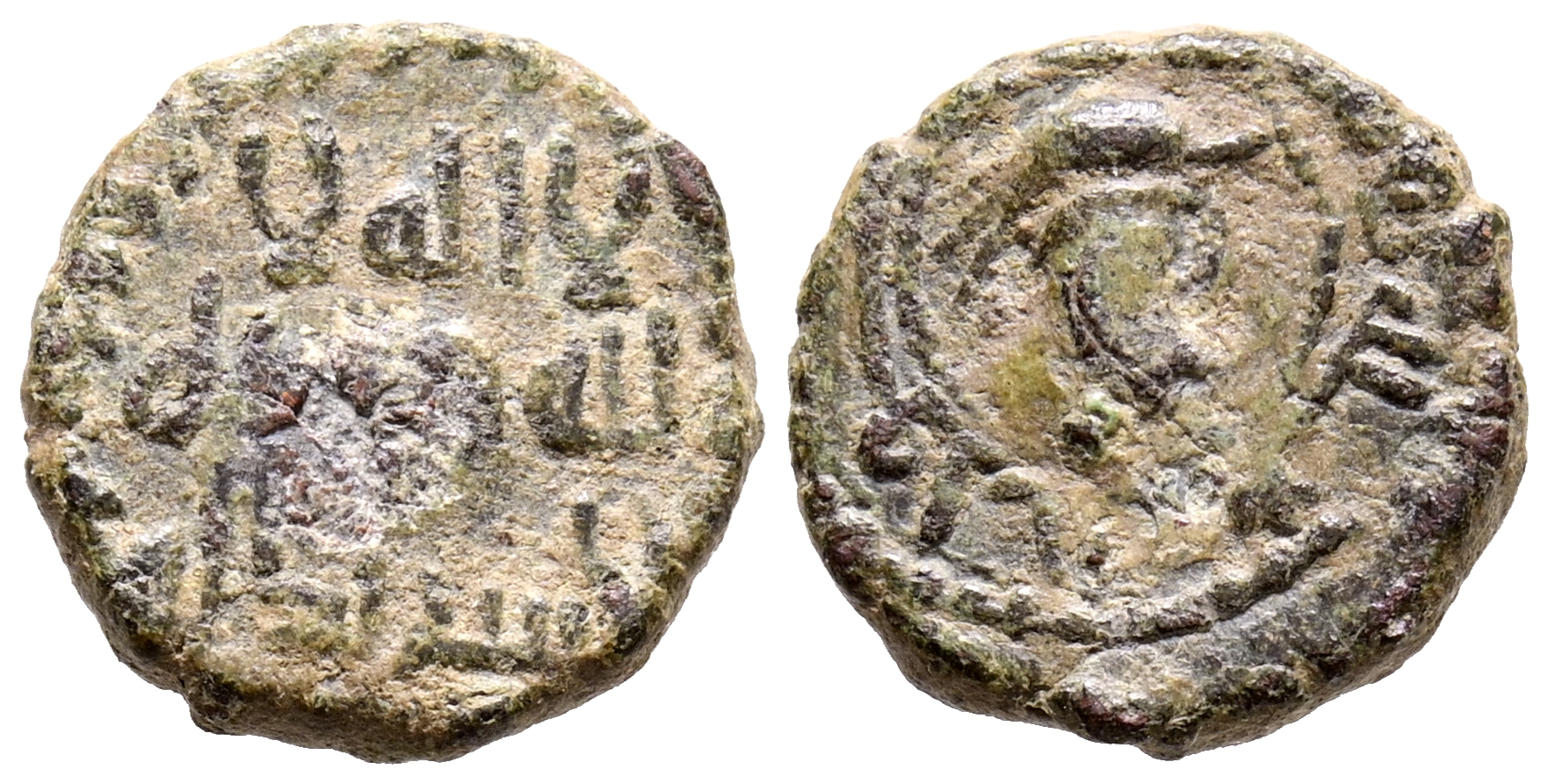 EMIRATO DEPENDIENTE DE CÓRDOBA, ÉPOCA DE LOS GOBERNADORES. Anónimo. Felús. (Ae. 1,22g/7mm). S/D. (Frochoso XIV-a; Walker-Th12). Obv: 'Sahada' en tres líneas rodeadas por un abalorio de hojas. Rev: Cabeza de guerrero mirando hacia la derecha, rodeada por la misión profética de Muhammad. MBC+.