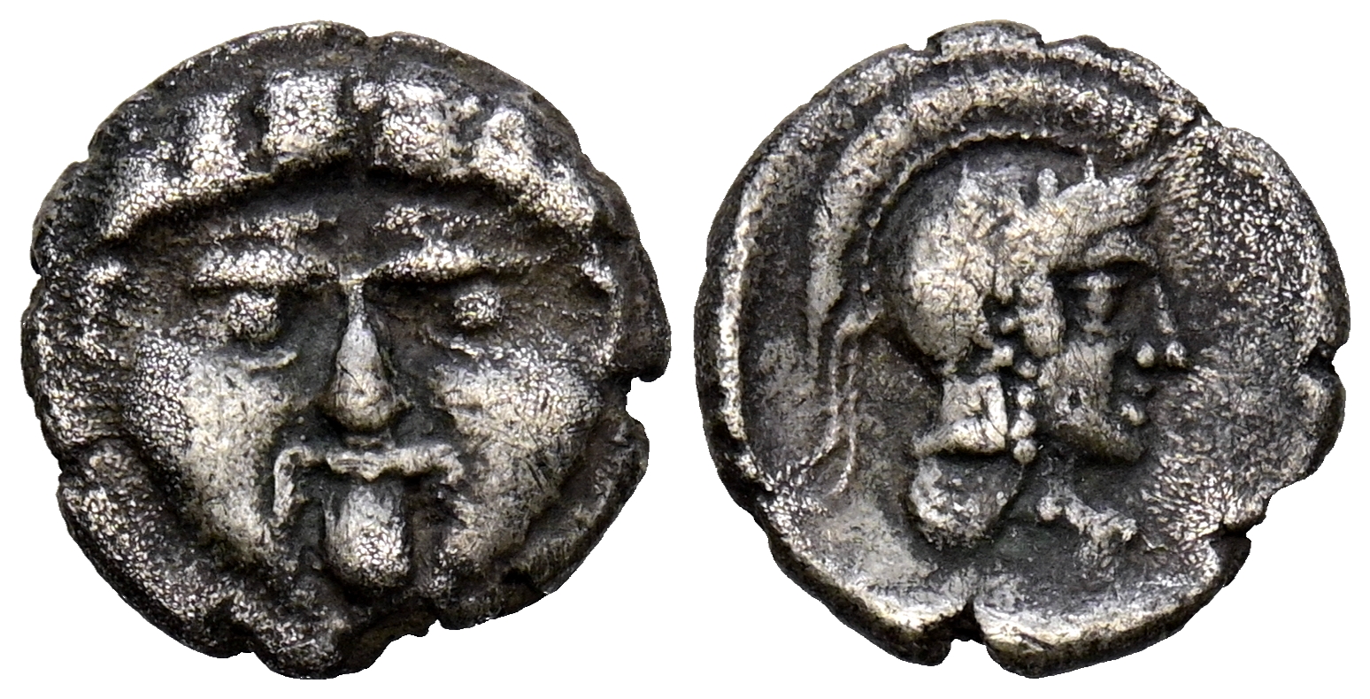 PISIDIA, Selge. Obolo. (Ar. 0,97g/10mm). 350-300 a.C. (SNG von Aulock 5278; SNG BnF 1932). Anv: Gorgoneion de frente. Rev: Cabeza de Atenas con casco a derecha, detrás astrágalos. MBC.