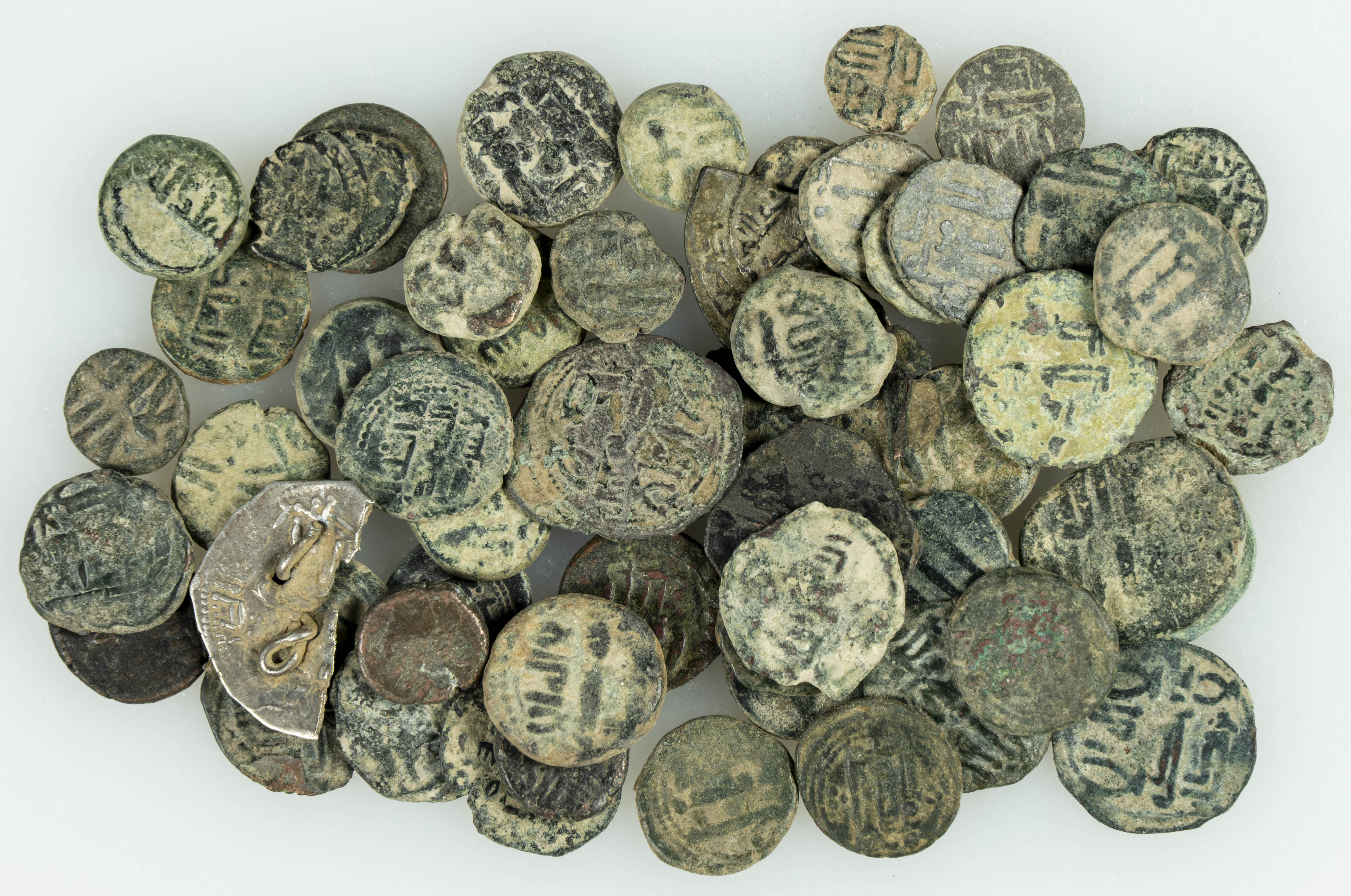 HISPANO ARABE. Interesante conjunto formado por 57 féluses, en su inmensa mayoría correspodientes al periodo de Gobernadores. A destacar, una gran variedad de tipos y variantes. Incluye algunos fragmentos de dirham. Diferentes módulos, pesos y calidades. A EXAMINAR.