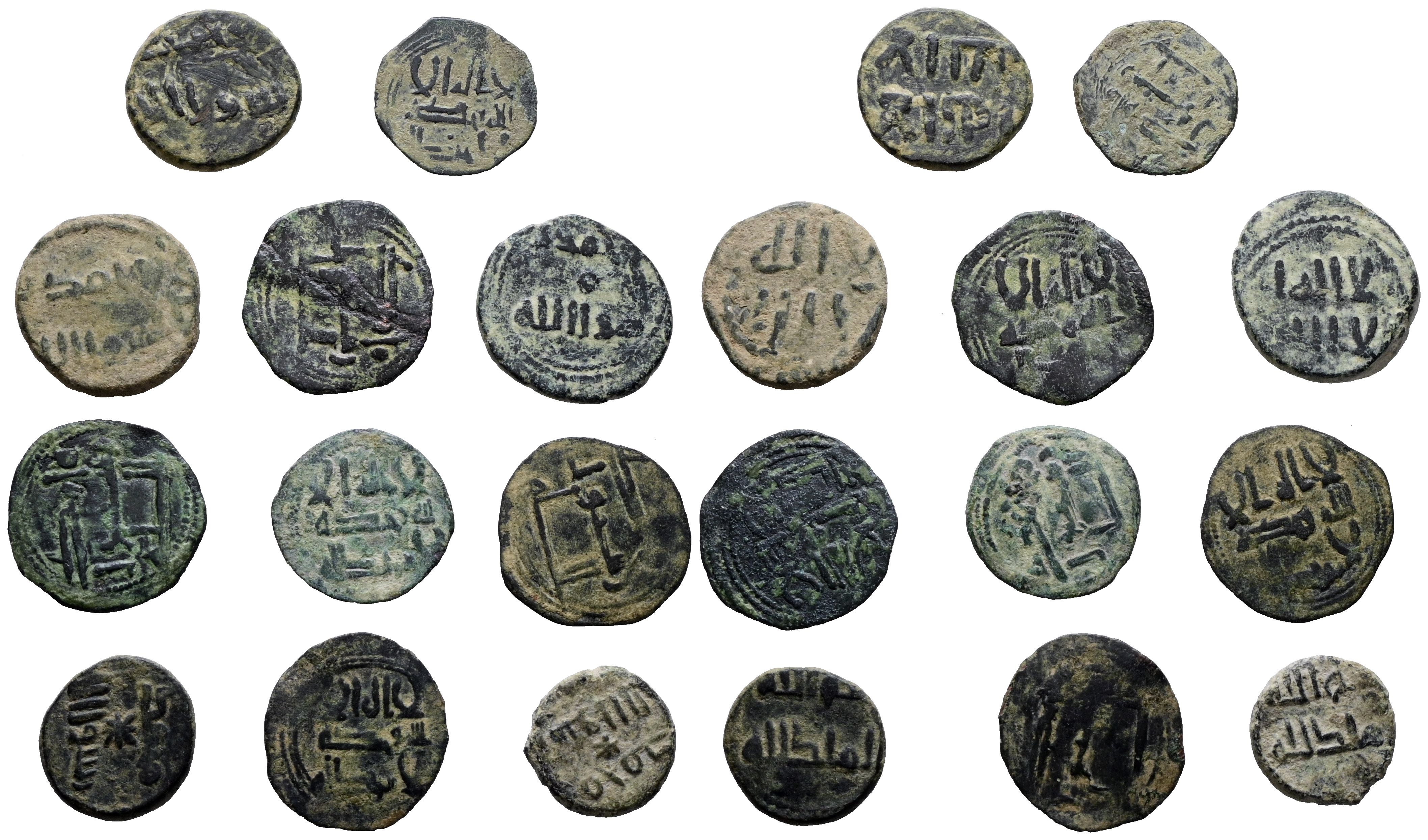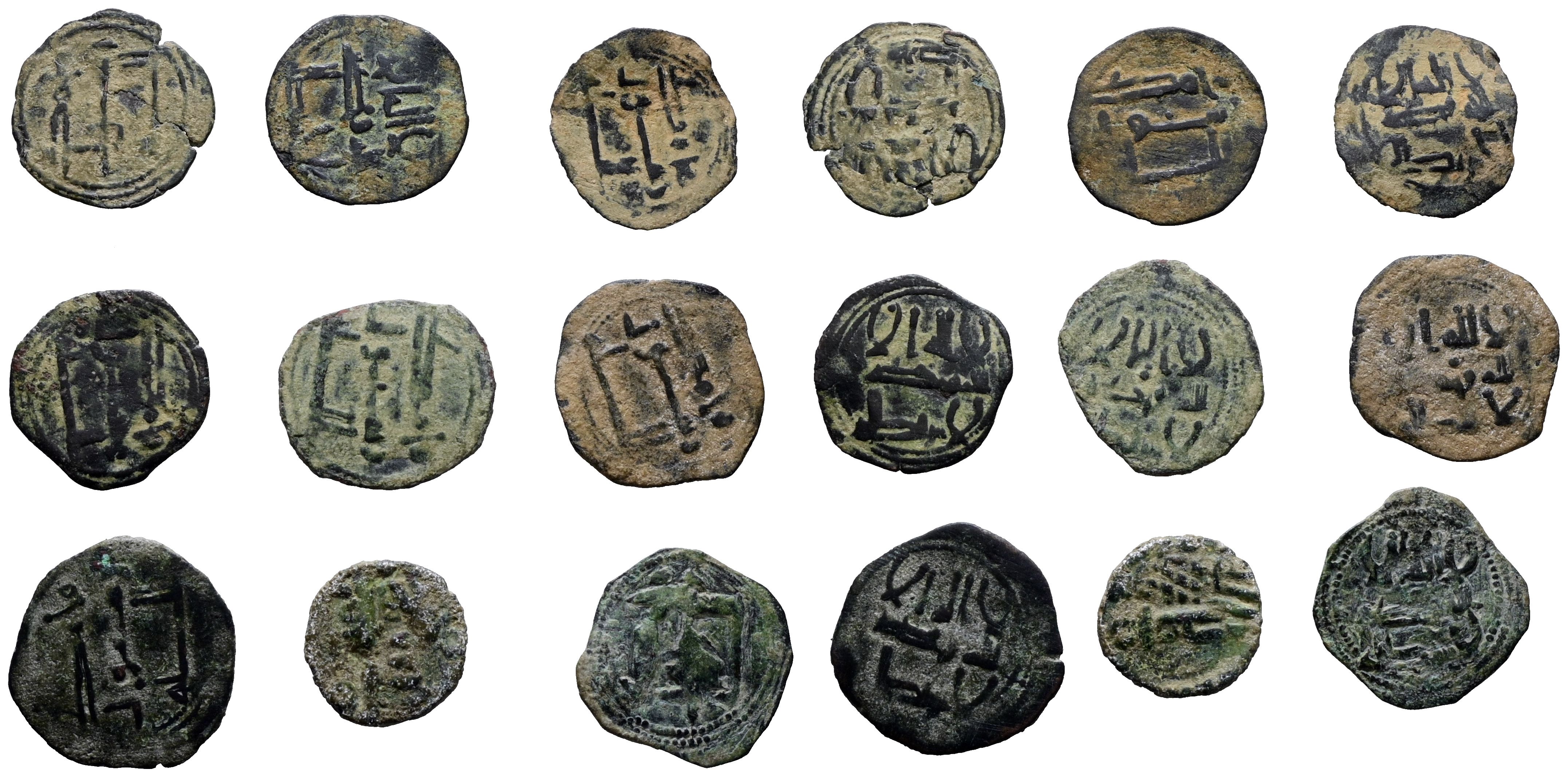EMIRATO DEPENDIENTE E INDEPENDETE DE CÓRDOBA. Interesantísimo conjunto formado por 20 félues que abarcan desde los primeros tipos, incluído el escaso 'felus de la invasión' hasta los atribuídos a Abd al-Rahman II. Diferentes medidas y estados de conservación. A EXAMINAR.
