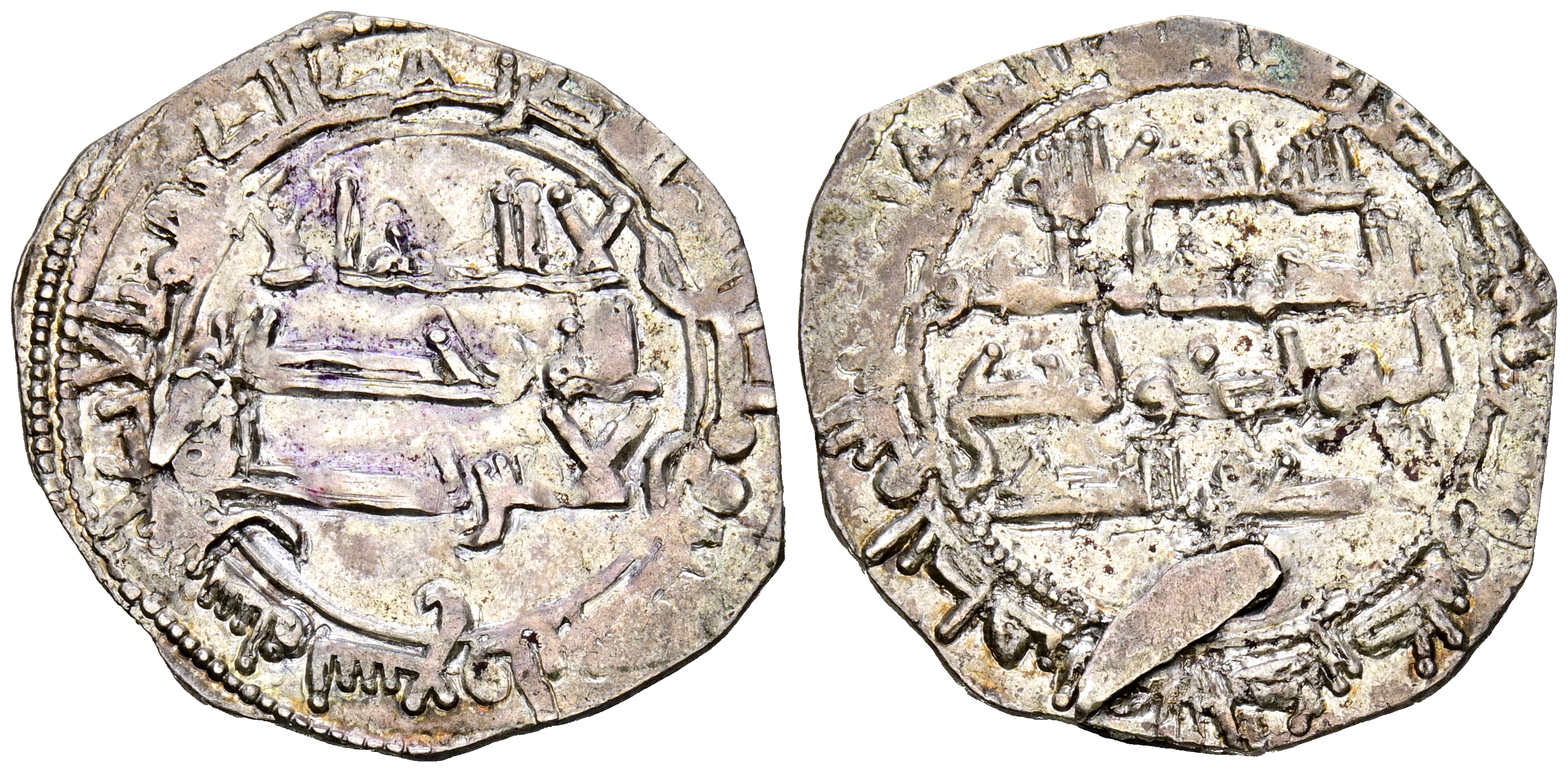 EMIRATO INDEPENDIENTE DE CÓRDOBA. Abd al-Rahman II. Dirham. (Ar. 2,00g/24mm). 229H. al-Ándalus / الاندلس. (Vives 187; Frochoso 229.2). MBC. Perforación con añadido de peso. Atractivo tono.