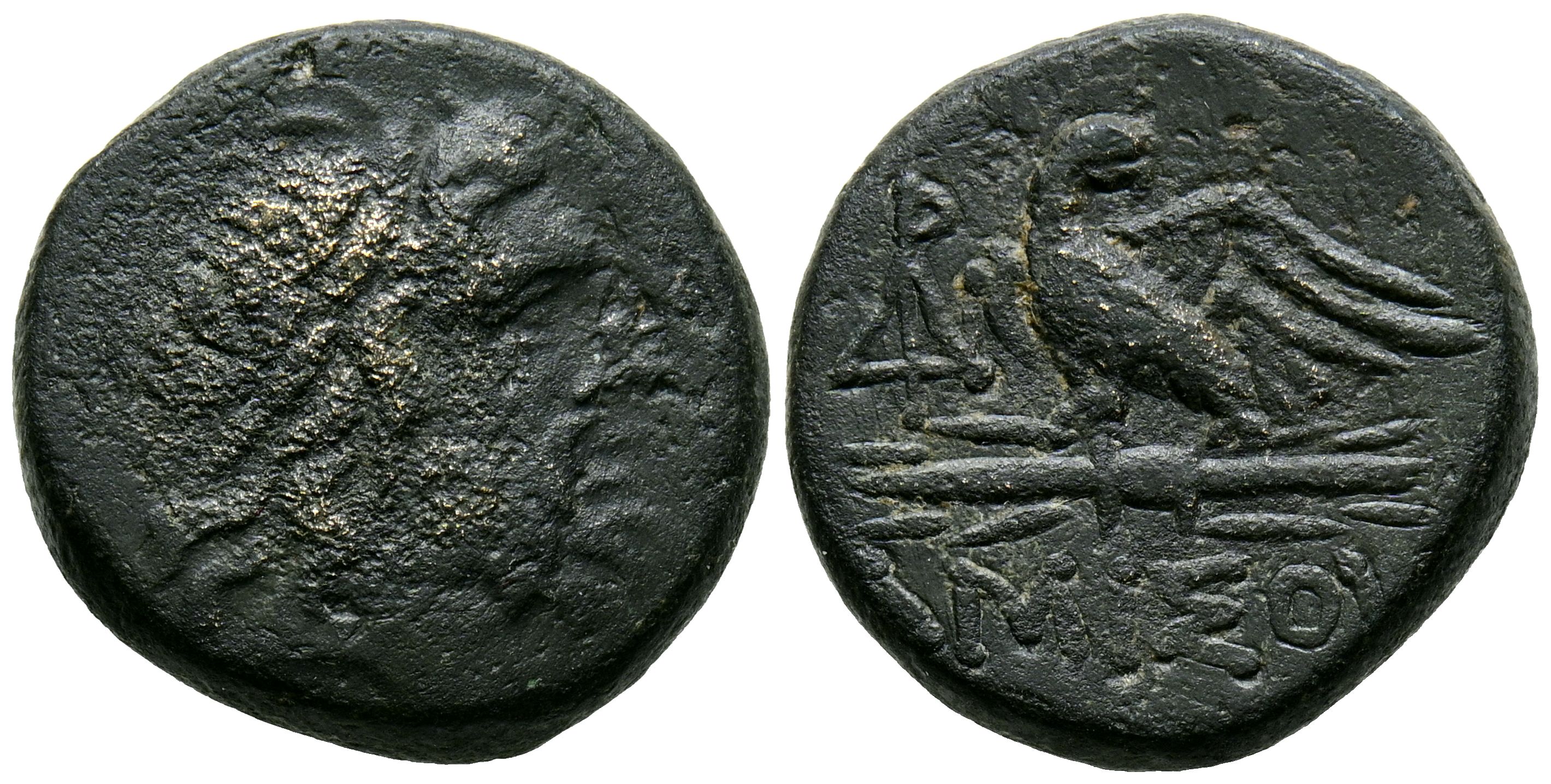 PONTOS, Amisos. Emisión cívica bajo Mitrídates VI, Eupátor. Ae20. (Ae. 8,12g/20mm). 85-65 a.C. (HGC 7, 421). Anv: Cabeza laureada de Zeus a la derecha. Rev: Aguila estante a izquierda mirando a derecha sobre un rayo, monograma en el campo, en exergo. AMIΣOY. MBC-/MBC.