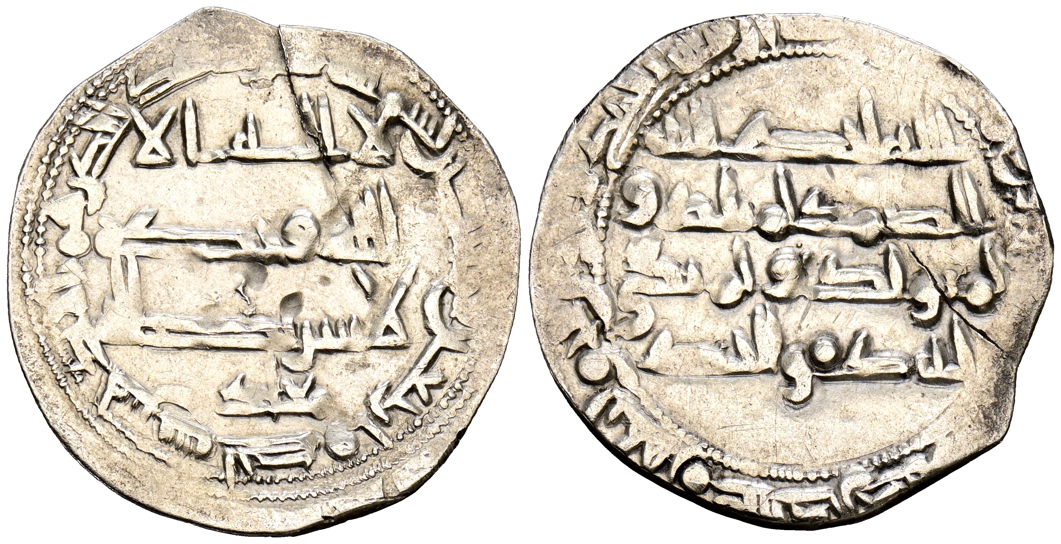 EMIRATO INDEPENDIENTE CÓRDOBA, Muhammad I. (Ar. 2,44g/25mm). 241H. al-Ándalus / الاندلس. (Vives 240; Frochoso 241.7). Citando a Mu'ad / معاد en IA. MBC-. Grieta.