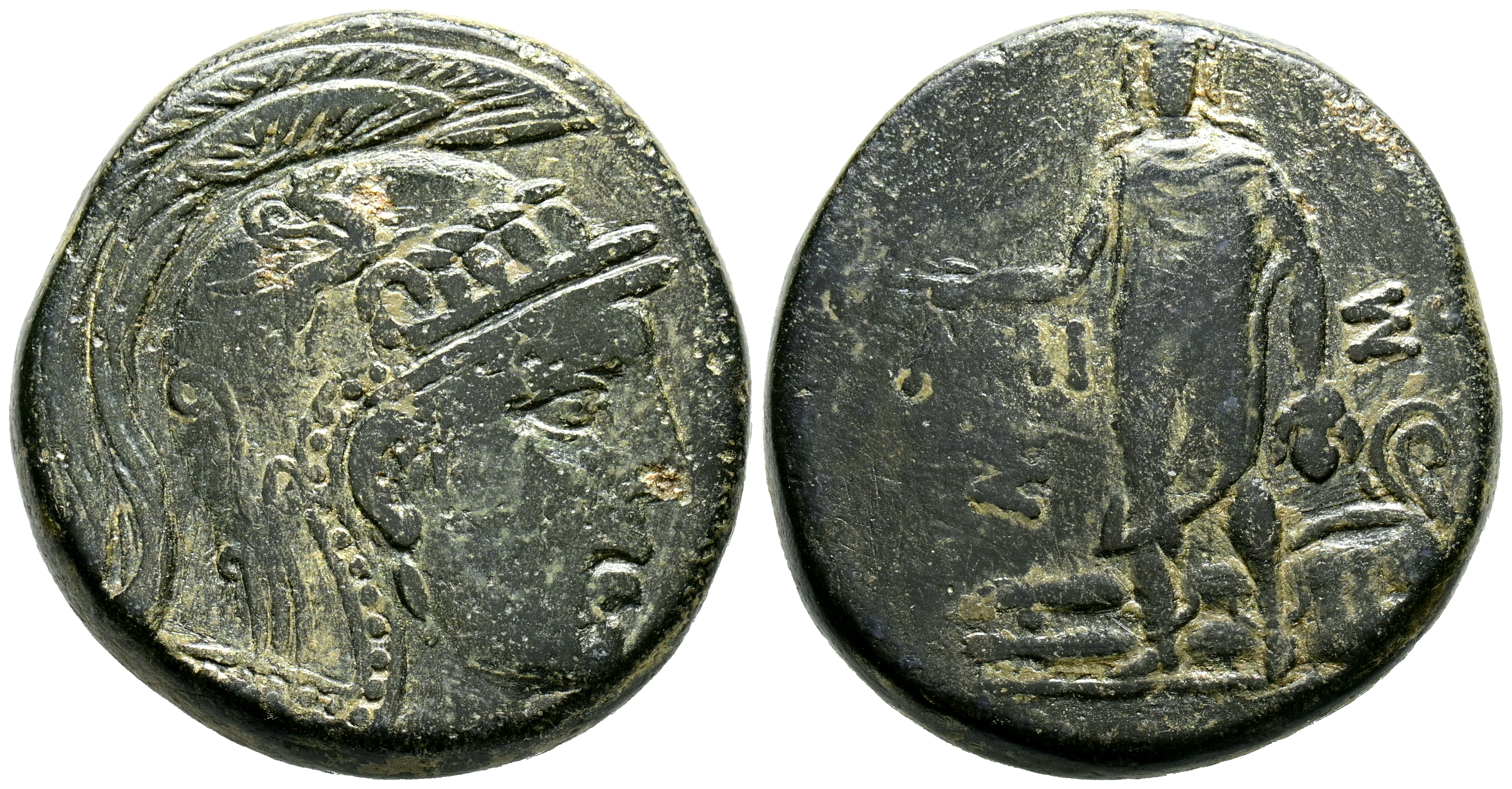 PONTOS, Amisos. Ae26. (Ae. 19,53g/26mm). 109-89 a.C. (SNG Stancomb 683-686). Anv: Cabeza con casco de Atenea a derecha. Rev: Perseo estante a izquierda sosteniendo arpa y cabeza de Medusa, cuyo cuerpo decapitado yace a sus pies, en campo: AMI-ΣOY y m onogramas. MBC.