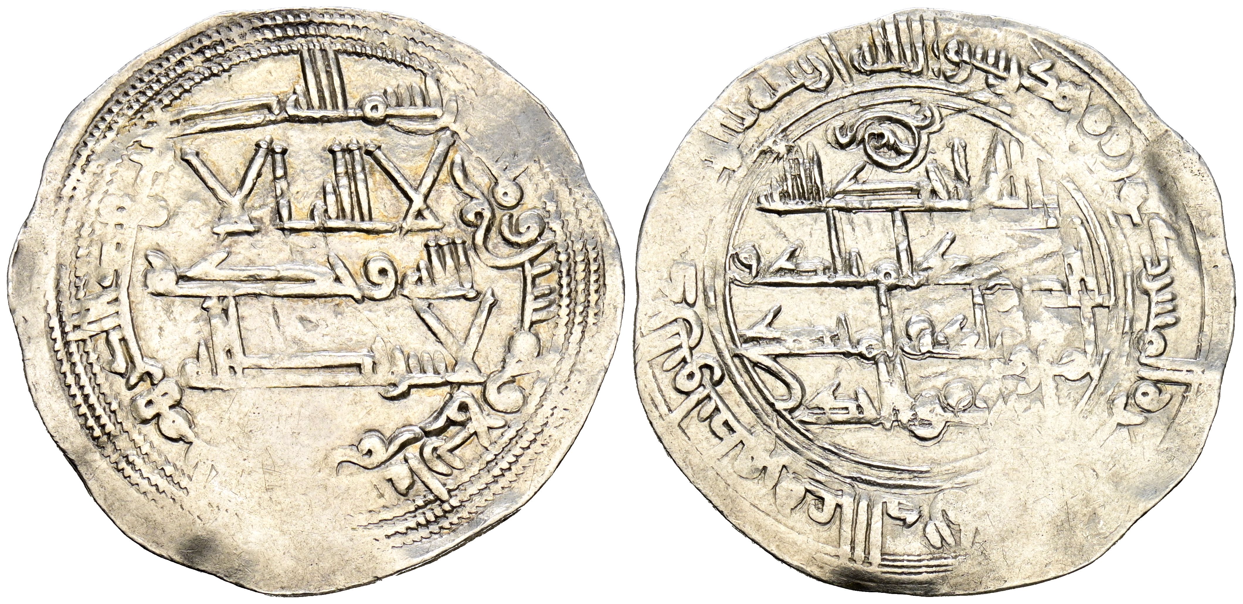 EMIRATO INDEPENDIENTE DE CÓRDOBA, Muhammad I. Dirham. (Ar. 2,61g/30mm). 254H. al-Ándalus / الاندلس. (Vives 268; Frochoso no cita esta combinación de adornos). MBC+. Vanos. Interesante ejemplar.