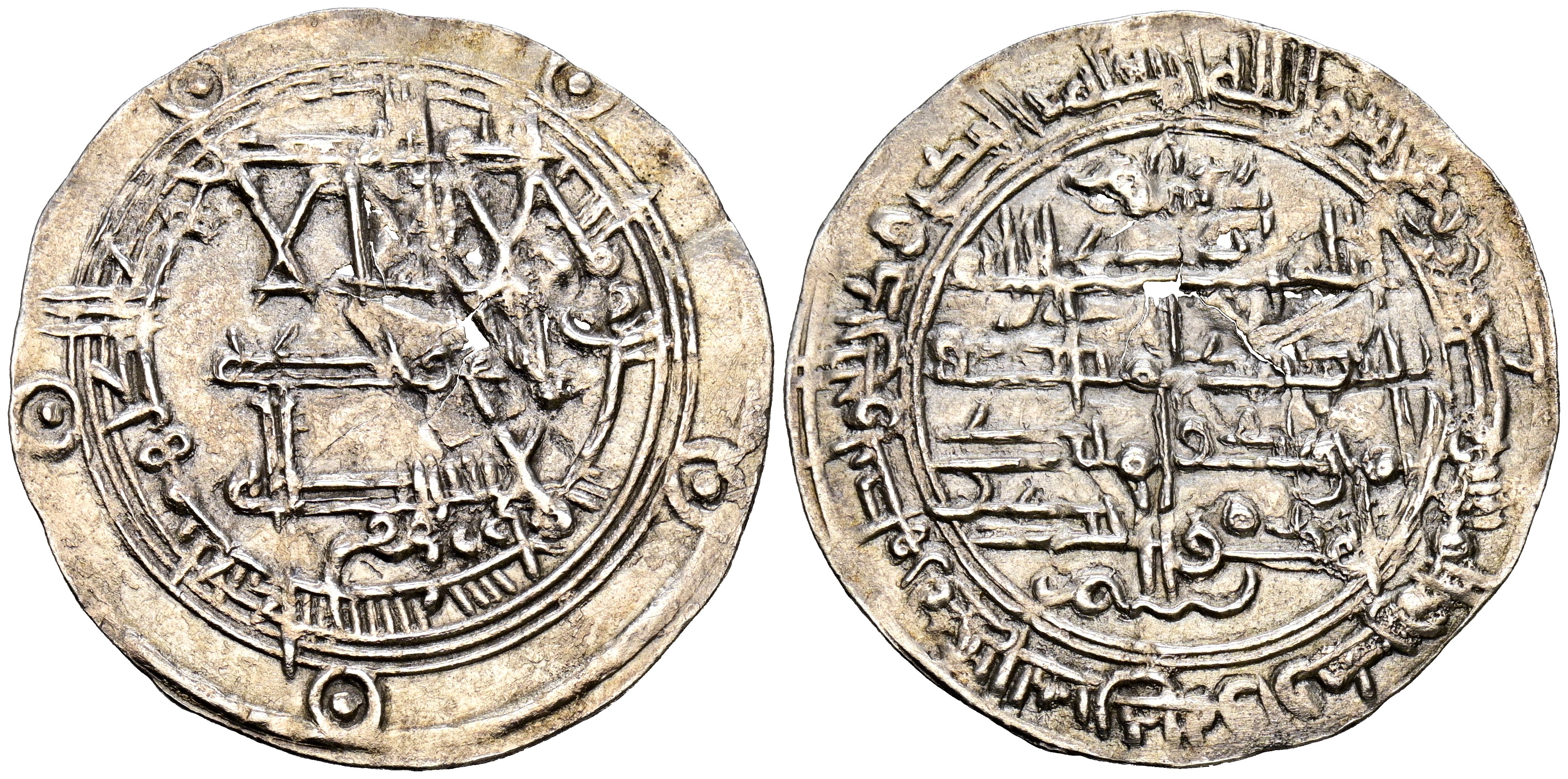 EMIRATO INDEPENDIENTE DE CÓRDOBA. Muhammad I. Dirham. (Ar. 2,58g/31mm). 267H. al-Ándalus / الاندلس. (Vives 303; Frochoso no cita esta combinación de adornos). MBC+. Grieta interna de acuñación. Precioso ejemplar.