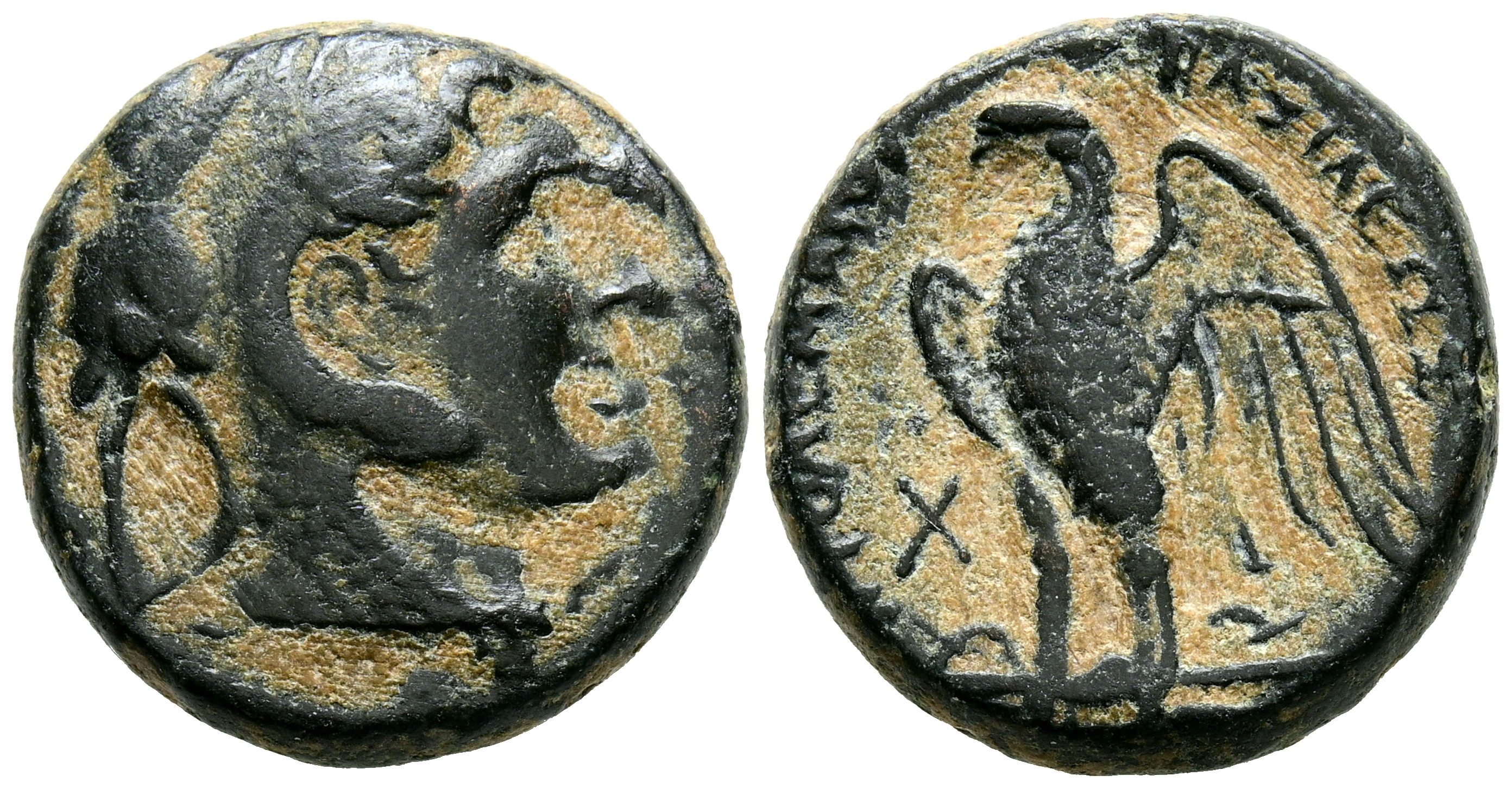 REINO PTOLEMAICO. Ptolomeo II Filadelfo. Óbolo. (Ae. 8,21g/20mm). 285-246 a.C. Alejandría. (Svoronos 450). Anv: Cabeza de Alejandro a la derecha, con tocado de piel de elefante. Rev: Águila en pie a la izquierda sobre un rayo, con las alas extendidas, alrededor leyenda griega. MBC.