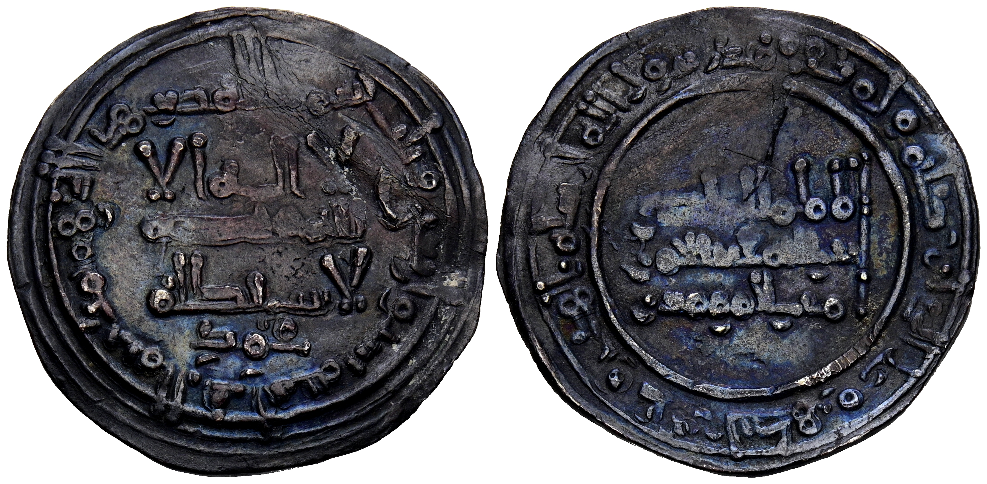 CALIFATO DE CÓRDOBA, 'Abd al-Rahman III. Dirham. (Ar. 3,01g/23mm). 346H. Madinat al-Zahra / مدينة الزهرا. (Vives 429; Frochoso 346.6). Citando a Mohammad / محمد en IA. MBC. Pátina oscura con reflejos azulados.