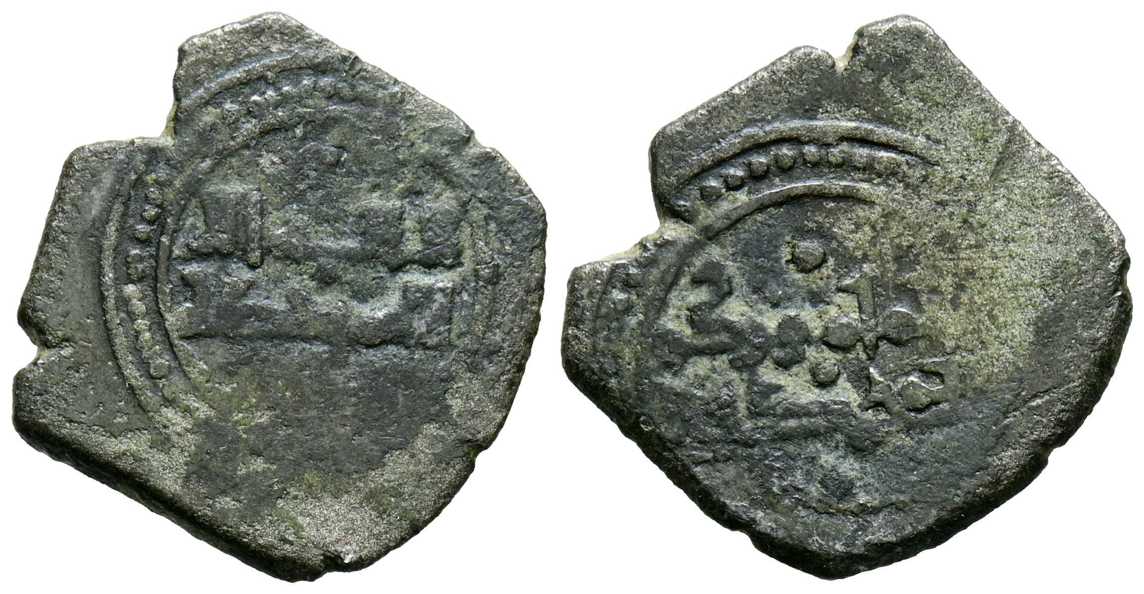 TAIFAS DEL CALIFATO, TOLEDO (Banu Du-l-Nun). Yahya I al-Ma'mun (435-467H). Dirham fraccionario. (Ve. 1,22g/16mm). S/D. (Tipos; Vives 1099 y Prieto y Vives 332). Emisión en vellón con tipos de fracción de dinar. MBC+. Esacasa. Ex Ibercoin Subastas, Su basta Online 23 (03/04/2019), Nº lote 326.