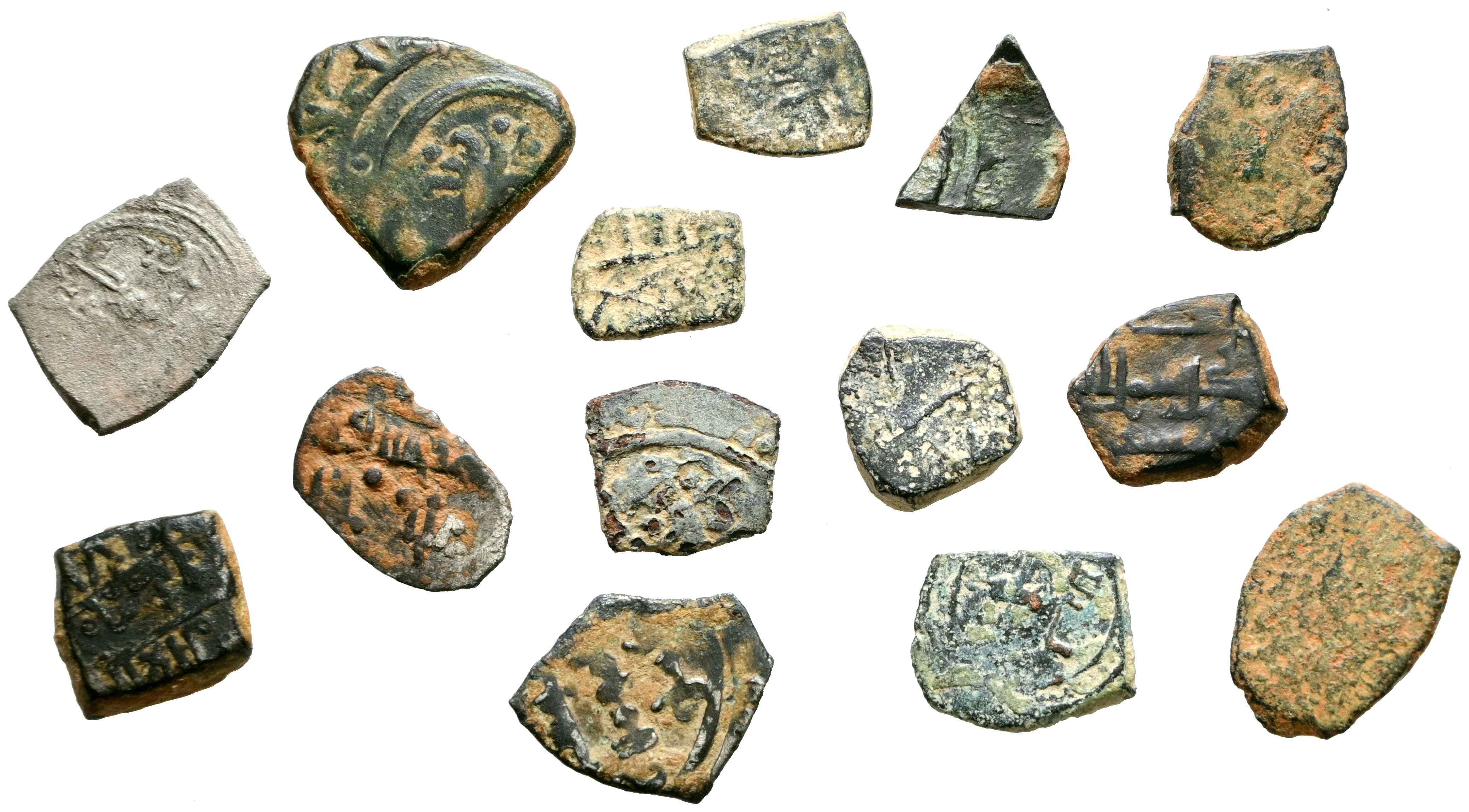TAIFAS DEL CALIFATO Y ALMORAVIDES. Interesantísimo conjunto formado 14 fracciones de dirham o handus. Diferentes emisores, medidas y estados de conservación. A EXAMINAR.