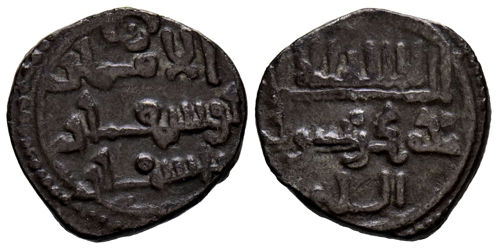 ALMORAVIDES, Yusuf ben Tashfin (480-500H). Quirate. (Ar. 0,81g/12mm). S/D. (Vives 1535; Benito Ba12). Anv: 'Shahada' en cuatro líneas. Rev: Presenta a Yusuf sin títulos ni heredero. MBC. Pátina oscura. Escasa.