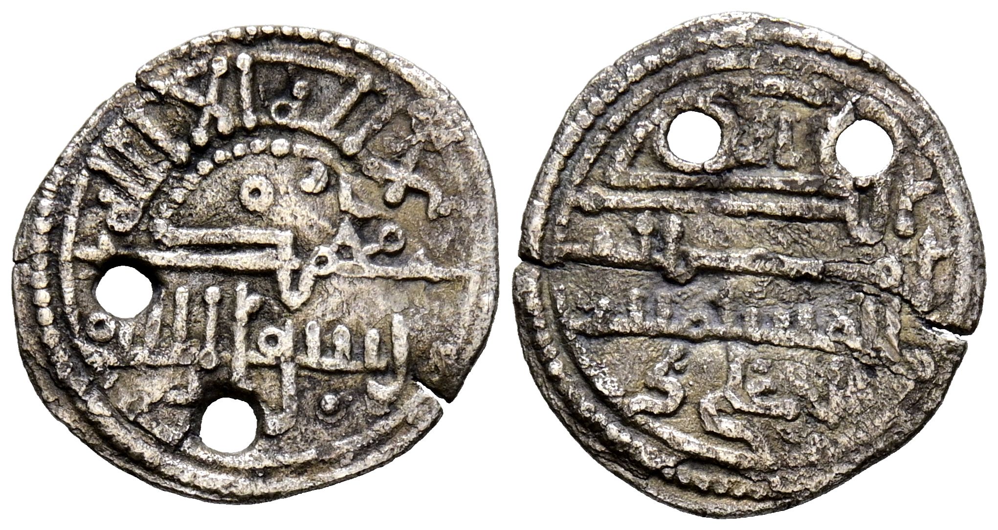 ALMORAVIDES, Ali ben Yusuf (500-537H). Quirate. (Ar. 0,71g/15mm). S/D. (Vives 1703; Peligro 926; Benito Cb41). Anv: 'Shahadah' en semicírculo y dos líneas. Rev: Se presenta a Ali con título de Amir al-Muslimin y sin heredero, arriba en dos líneas: ال له / ايــد. (Dios ayude). MBC-. Dos perforaciones.