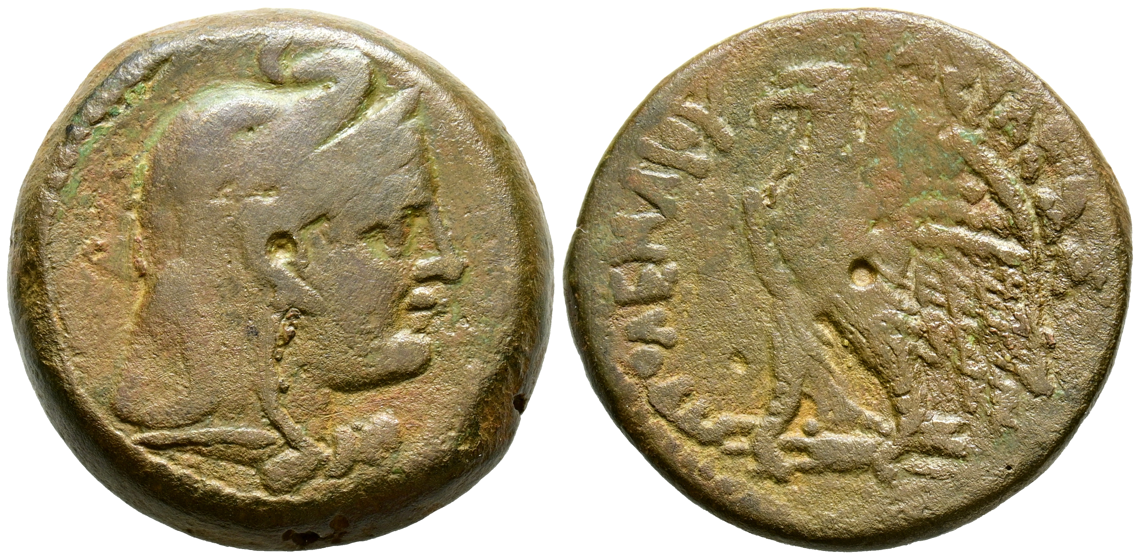 REINO PTOLEMÁICO, Ptolomeo V Epifanes o Ptolomeo VI Philometor. Ae25. (Ae. 14,65g/25mm). 204-145 a.C. (Svoronos 1236; SNG Copenhaguen 249-252). Anv: Cabeza de Alejandro III el Grande a derecha con piel de elefante. Rev: Águila estante a izquierda sobre rayo, alrededor leyenda griega. MBC. Escaso ejemplar.