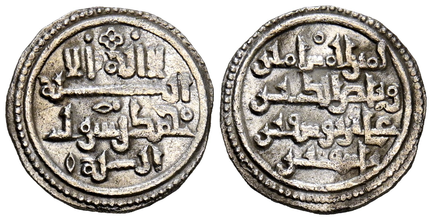 ALMORAVIDES, 'Ali ben Yusuf (500-537H). Quirate. (Ar. 0,91/13mm). (Vives no cita; Martínez 14; Eustache 315A; Benito Cc8). Anv: 'Shahada' en cuatro líneas. Rev: امير المسلين (Amir al-Muslimin) / و ناصرالدين (y Nasir al-Din) / علي بن توسف بن (Ali hijo de Yusuf hijo de) / قا شفين (Tashfin). EBC. Limpiada. Muy rara.
