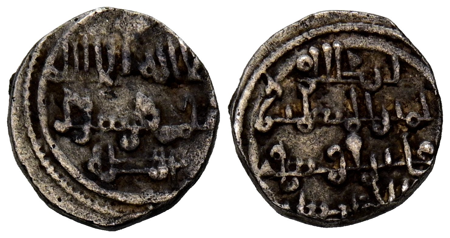 ALMORÁVIDES, Ali ben Yusuf y el Emir Sir (522-533H). Quirate. (Ar. 0,92g/10mm). S/D. (Vives No cita; Matínez 26; Benito Ce13). Anv: 'Shahada' en tres líneas. Rev: Presenta a Ali con títulos de Amir al-Muslimin, arriba: ايد الله, abajo mención: الامير سير. MBC. Escasa.
