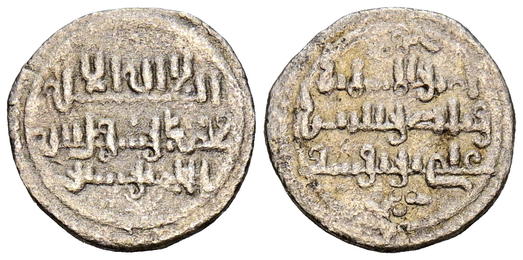 ALMORÁVIDES, Ali ben Yusuf y el emir Tashfin (533-537H). Quirate. (Ar. 0,66g/11mm). S/D. (Vives 1824; Medina 139; Benito Cj3). Anv: 'Shahada' en tres líneas, debajo mención al heredero: الامير تاشفين. Rev: Presenta a Ali con títulos de Amir al-Muslim in y Nasir al-Din. MBC.