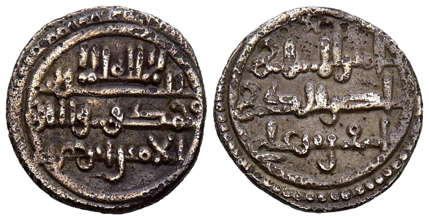 ALMORAVIDES. Tashfin ben Ali y Emir Ibrahim. Quirate. (Ar. 0,91g/12mm). S/D. (Vives no cita; Hazard 1036; Benito Db3). Anv: 'Shahada' en tres líneas, debajo meción al heredero: الامير ابرهيم. Rev: Presenta a Tashfin con los títulos de Amir al-Muslimi n y Nasir al-Din. MBC.