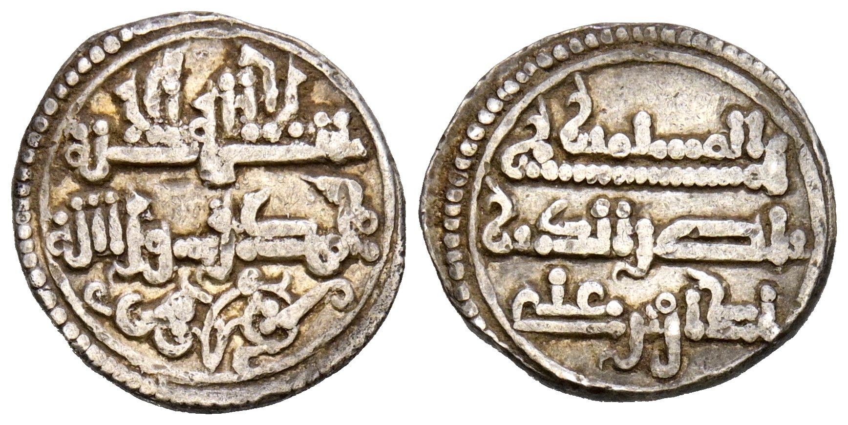 ALMORAVIDES, Ishaq ben Alí (540-541H). Quirate. (Ar. 0,95g/12mm). S/D. (Vives 1896; Benito E2). Anv: 'Sahada' en tres líneas, debajo adorno vegetal. Rev: Presenta a Ishaq con título de amir al-Muslimin y Nasir al Din. MBC+. Escaso.