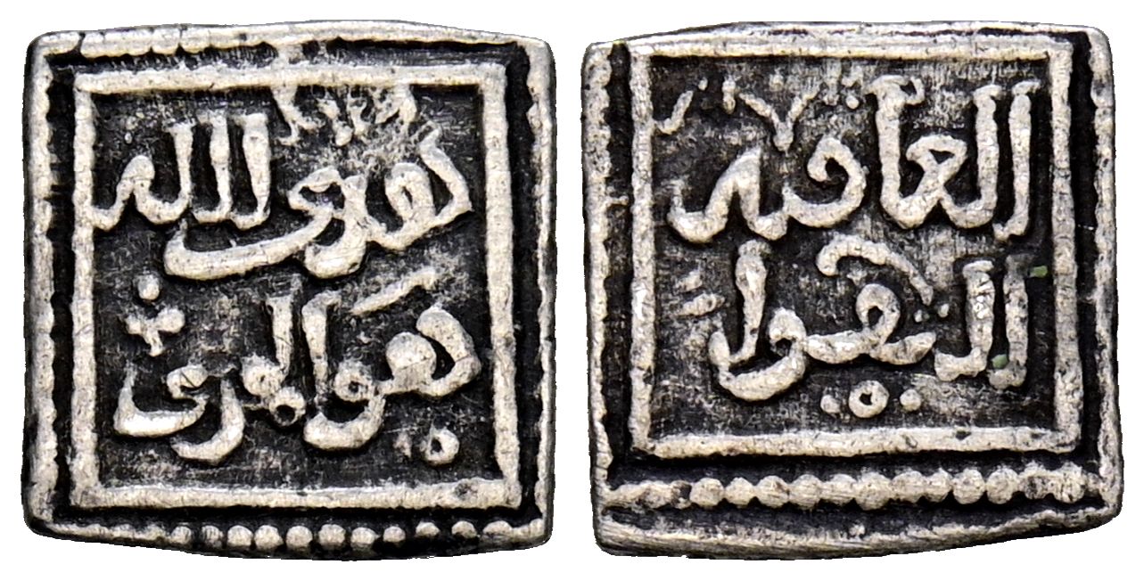 ALMOHADES, Anónimo. 1/4 Dirham. (Ar. 0,36g/9mm). (Vives 2209, como Nazarí; Medina 203a; Hohertz 636). Anv: هدى الله / هو الهدى. (La guía de Allah / es la guía). Rev: العا قبة / التقوا. (La recompensa del más allá / pertenece a los devotos). MBC+.