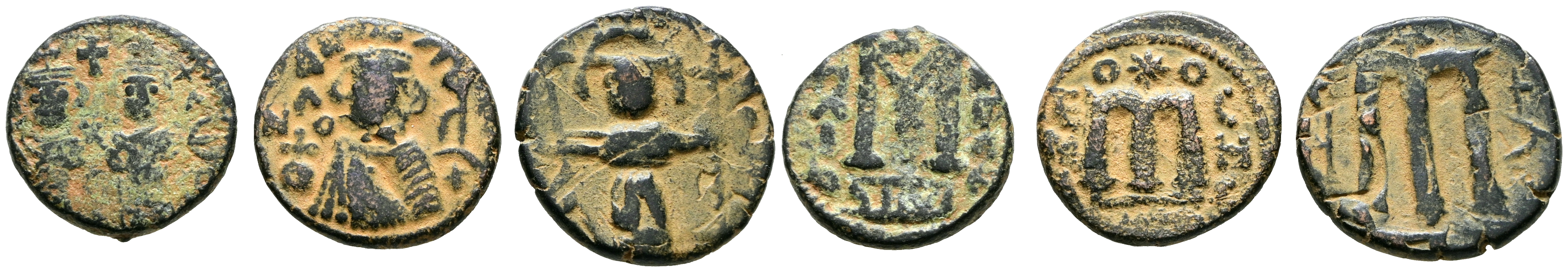 CALIFATO OMEYA DE DAMASCO. Interesante conjunto de 3 acuñaciones transicionales arabo-bizantinas. Diferentes ceca, variantes y estados de conservación. A EXAMINAR.