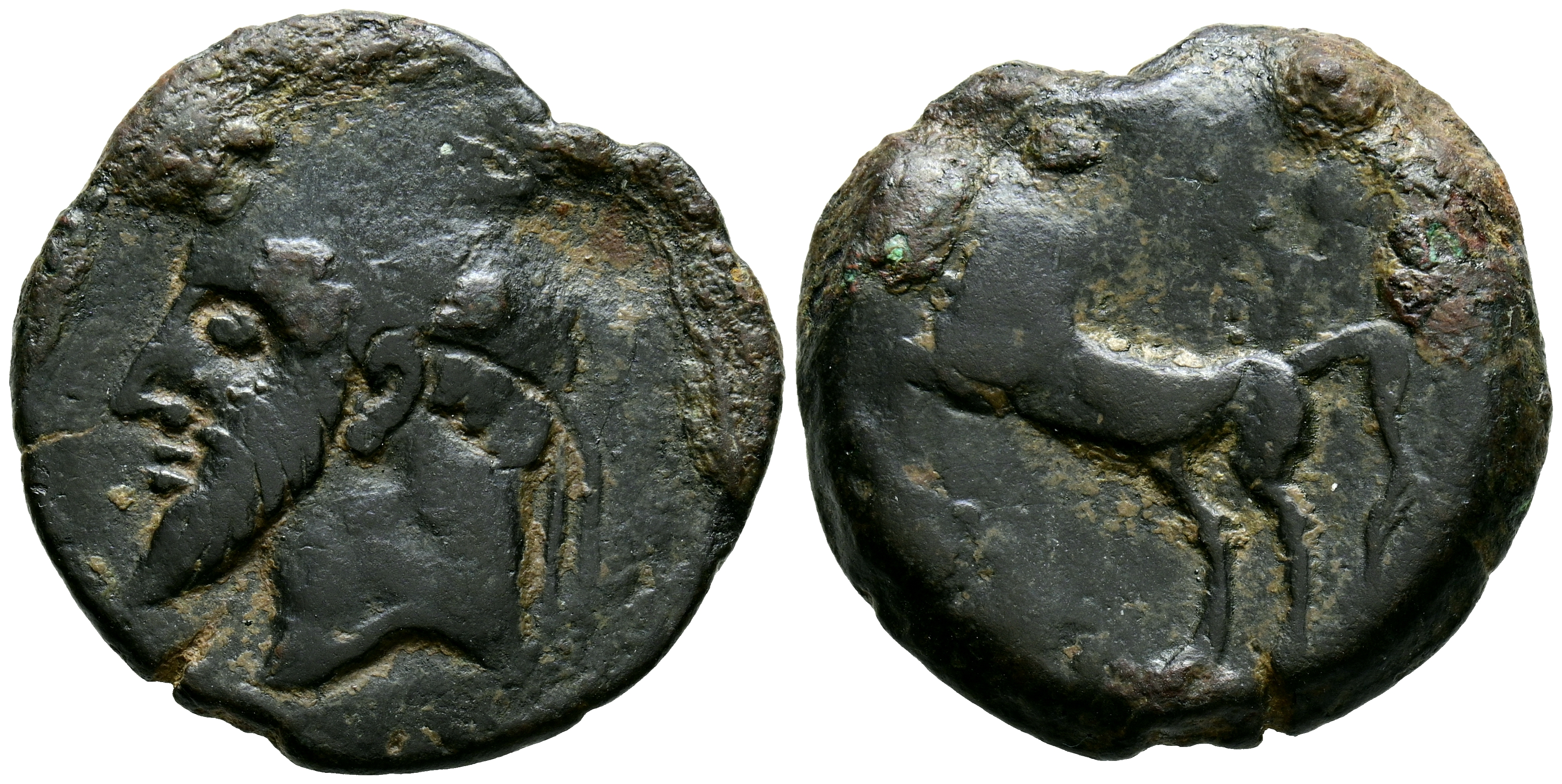 REYES DE NUMIDIA, Massinissa o Micipsa. Ae26. (Ae. 12,52g/27mm). 203-118 a.C. (SNG Copenhagen 505). Anv: Cabeza masculina laureada a izquierda. Rev: Caballo saltando a izquierda. MBC.